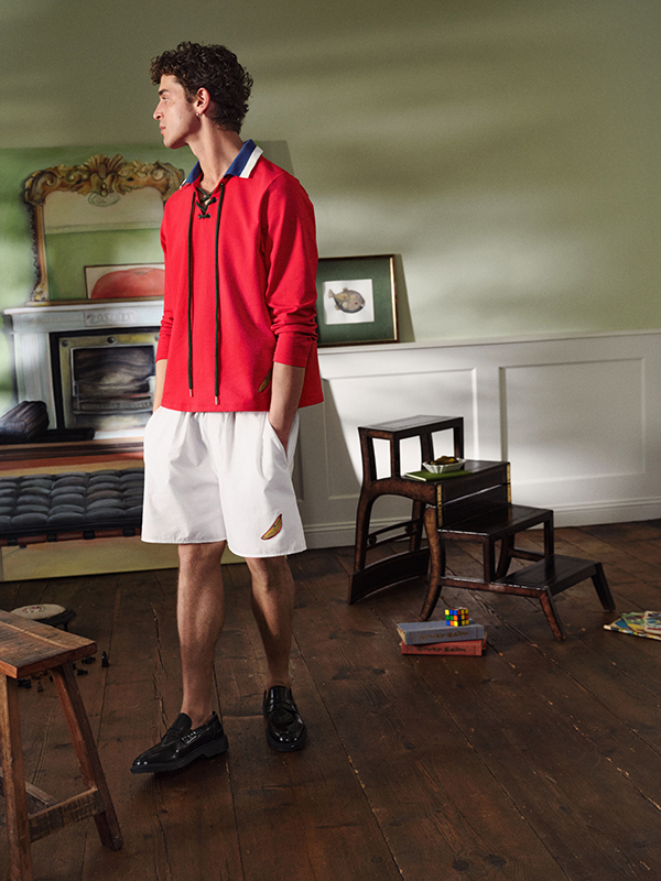 Charlotte Adam creates visual highlights through a palette of bold, collegiate-inspired colors: Estate Blue, Cherry Red, and Branch Green —vibrant shades perfect for summer. The tops draw inspiration from HANRO favorites such as ‘Touch Feeling’, the ribbed ‘Sleep & Lounge’ top, and the classic T-shirt from the ‘Natural Shirts’ line, along with a silk top from the ‘Grand Central’ collection. A standout piece is the sailor-collar shirt.The bottoms are based on ‘Touch Feeling’, ‘Fancy Woven’ and ‘Sleep & Lounge’ styles.