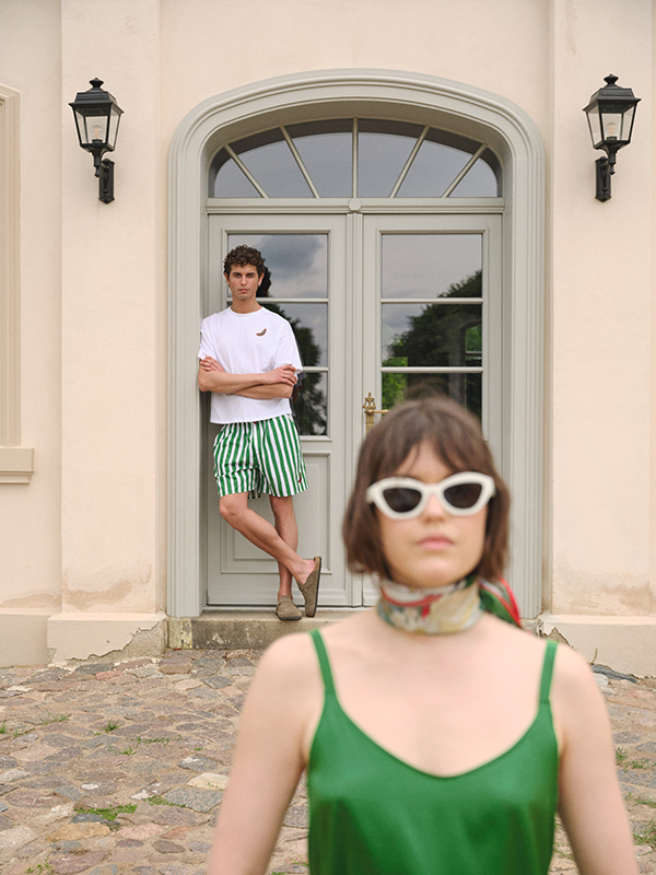 Charlotte Adam creates visual highlights through a palette of bold, collegiate-inspired colors: Estate Blue, Cherry Red, and Branch Green —vibrant shades perfect for summer. The tops draw inspiration from HANRO favorites such as ‘Touch Feeling’, the ribbed ‘Sleep & Lounge’ top, and the classic T-shirt from the ‘Natural Shirts’ line, along with a silk top from the ‘Grand Central’ collection. A standout piece is the sailor-collar shirt.The bottoms are based on ‘Touch Feeling’, ‘Fancy Woven’ and ‘Sleep & Lounge’ styles.