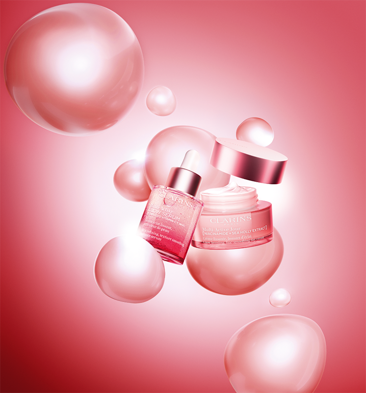 The immediate effects of Clarins‘ Multi-Active Glow Serum are proven. A clinical study showed that after 28 days, women’s skin was 45 percent more radiant, 43 percent smoother, their complexion 31 percent more even, and pores were 17 percent less visible.* In a survey, 94 percent of women reported that their skin was already radiant after seven days, and 92 percent felt their skin was energized.**