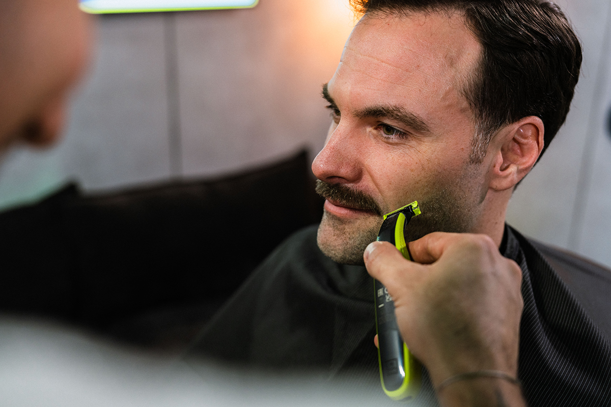 Auch The Icon League Kommentator Florian Malburg nimmt regelmäßig Platz auf dem Barbierstuhl bei den Matchdays und lässt sich vom Experten mit dem Philips OneBlade stylen.
