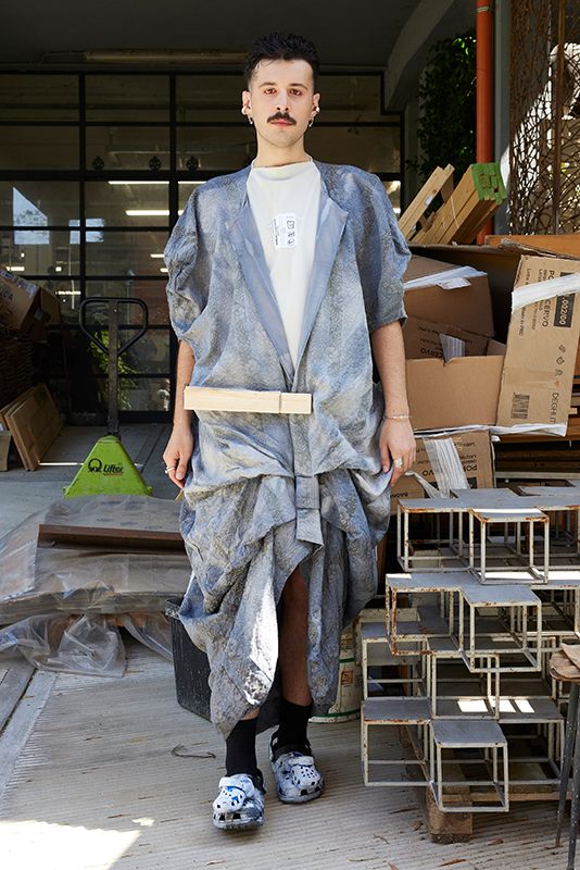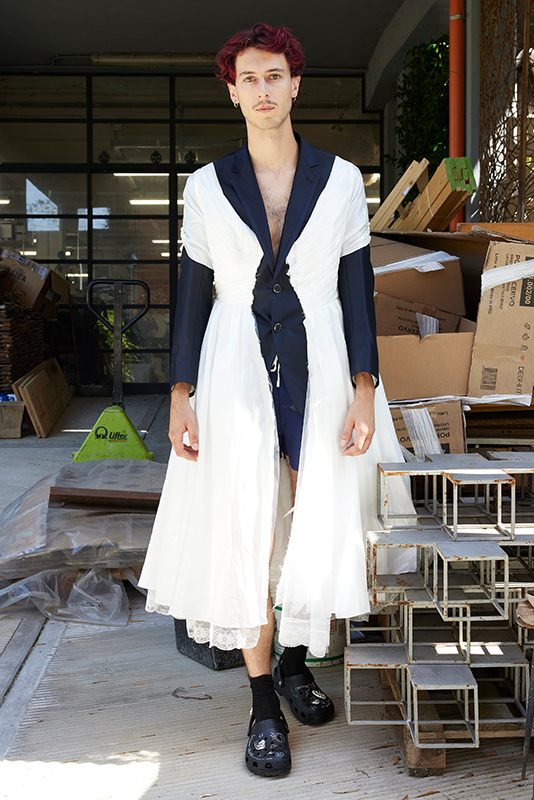 The result is a cleaner, more focused collection. The colours are exclusively shades of white, rope, ecru and shades of grey and black, obtained by dyeing, painting and bleaching. There are no flashy fabrics, aside from the first Simon Cracker all-over pattern. The „basic“ uniform consists of a square T-shirt and shorts inspired by men’s tailoring. Each outfit highlights a single garment and its unique features. Crocs‘ iconic models complete the uniform, in the same palette but ’crackerised’ one by one with graffiti, patches and customized JibbitzTM charms. We are bringing the focus back to the clothes, with few distractions. The collection revives some of our iconic garments (the Siamese T- shirt, the earthworm jacket, the posture shirt…), with the clear objective of creating unique, upcycled pieces that can be reproduced: the same but always different.