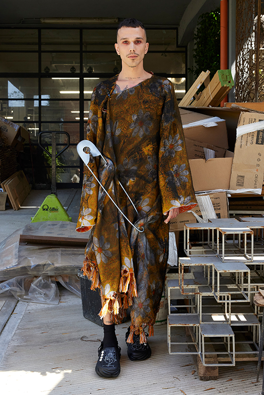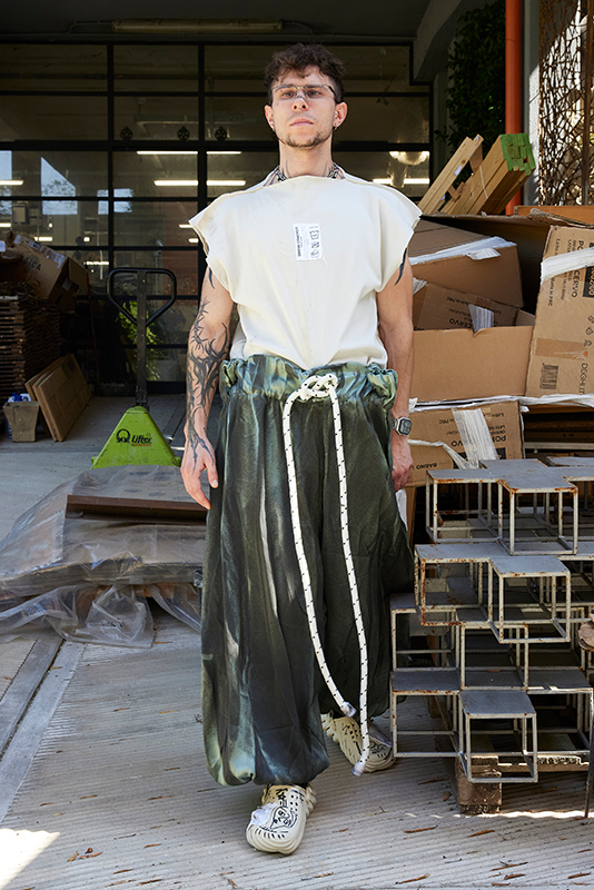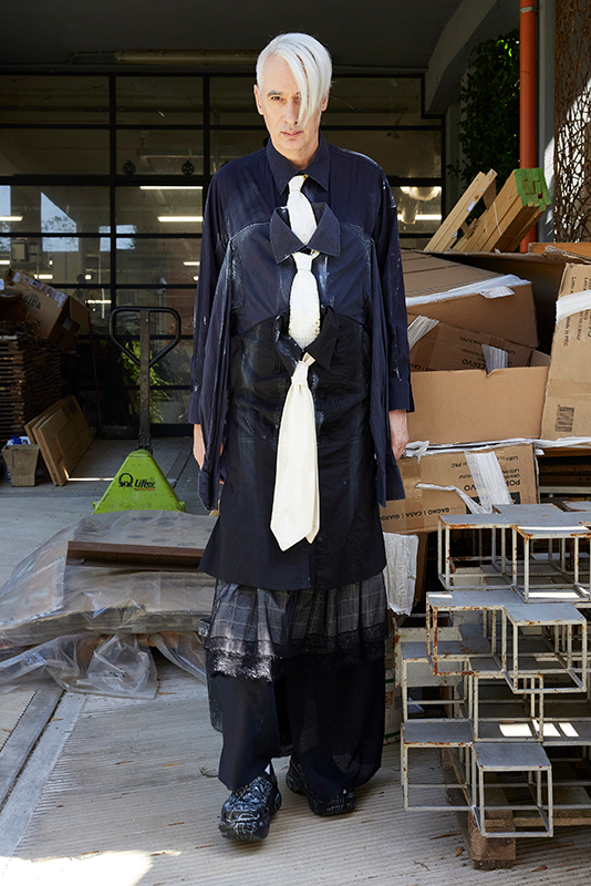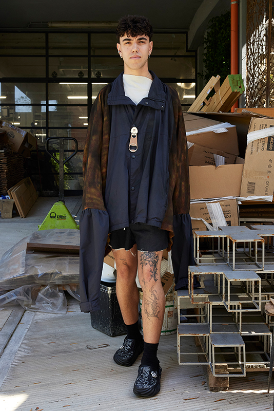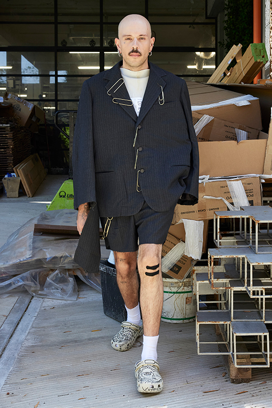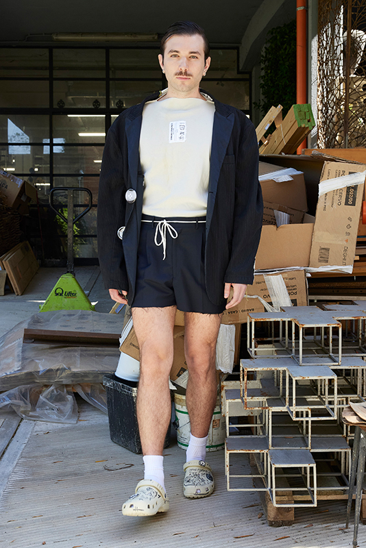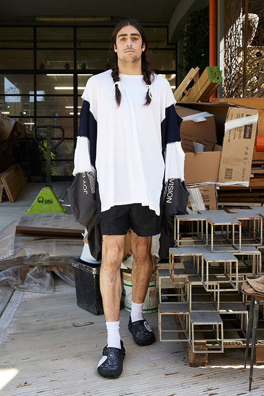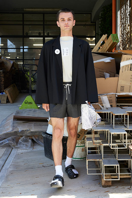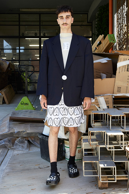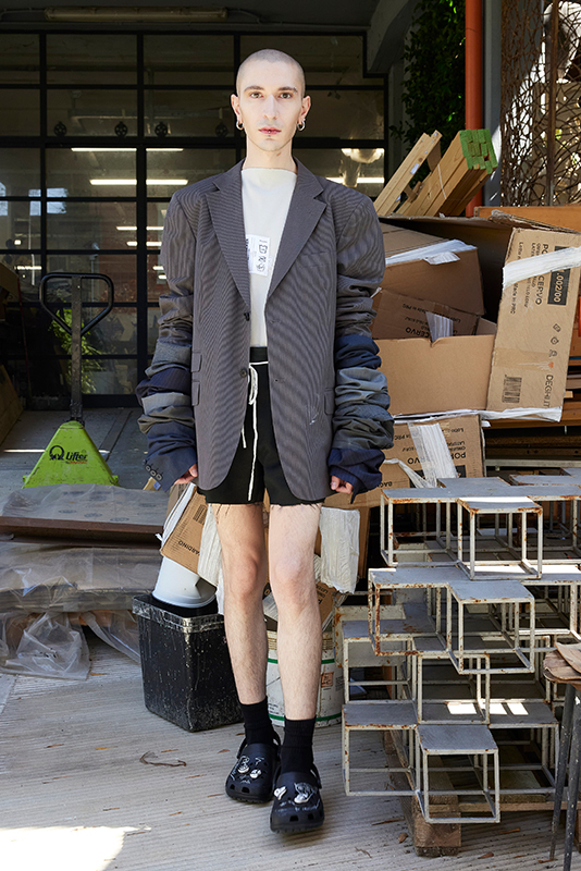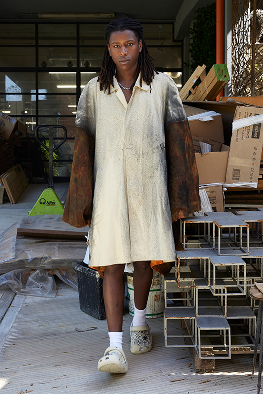 The result is a cleaner, more focused collection. The colours are exclusively shades of white, rope, ecru and shades of grey and black, obtained by dyeing, painting and bleaching. There are no flashy fabrics, aside from the first Simon Cracker all-over pattern. The „basic“ uniform consists of a square T-shirt and shorts inspired by men’s tailoring. Each outfit highlights a single garment and its unique features. Crocs‘ iconic models complete the uniform, in the same palette but ’crackerised’ one by one with graffiti, patches and customized JibbitzTM charms. We are bringing the focus back to the clothes, with few distractions. The collection revives some of our iconic garments (the Siamese T- shirt, the earthworm jacket, the posture shirt…), with the clear objective of creating unique, upcycled pieces that can be reproduced: the same but always different.