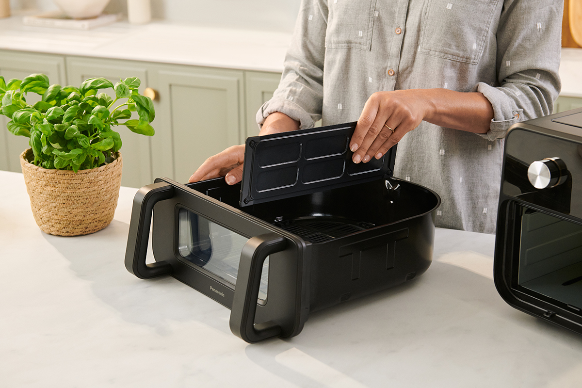 Jedes Detail des Panasonic Flex Air Fryers wurde entwickelt, um das Kochen zu erleichtern. Das Sichtfenster mit LED-Beleuchtung ermöglicht es, Speisen im Auge zu behalten, ohne den Korb öffnen zu müssen. Auf diese Weise trägt es dazu bei, Energie zu sparen und eine gleichmäßige Gartemperatur zu halten. Dank der BPA- und PFAS-freien Antihaftbeschichtung ist der Garkorb des Flex Air Fryer ausgesprochen pflegeleicht. Der herausnehmbare Garkorb-Einsatz und -Trennsteg sind darüber hinaus spülmaschinengeeignet. So ist der NF-BC1000 mit minimalem Aufwand schnell wieder einsatzbereit.