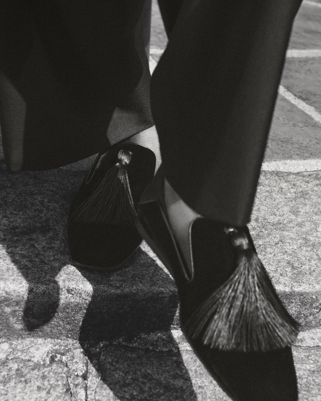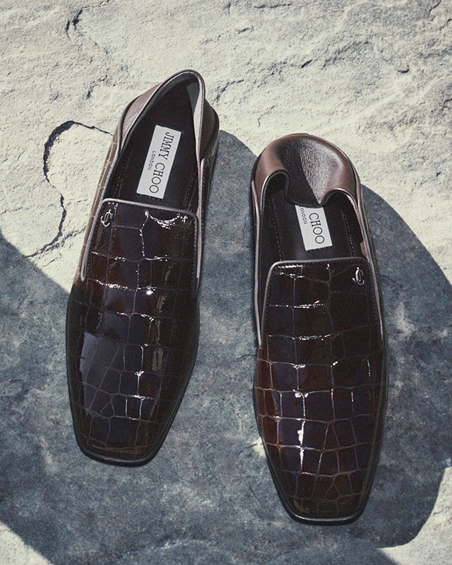The slipper has long been a Jimmy Choo classic, for all genders – THE SLIDE, introduced in 1999 and reissued in 2025 – reflects the low silhouette and squared-off toe. Launched in 2013, the FOXLEY – a tasselled slipper that has become a red-carpet staple – remains a key men’s style. The ELIOT reinvents this silhouette, using the shape as a canvas for different explorations of embellishment and material. ELIOT is light and refined; proposed both paper-flat, and with a 45mm stacked heel, for men and women alike. Textiles and treatments are shared – the flat features a collapsible back, allowing it to be styled as a mule.