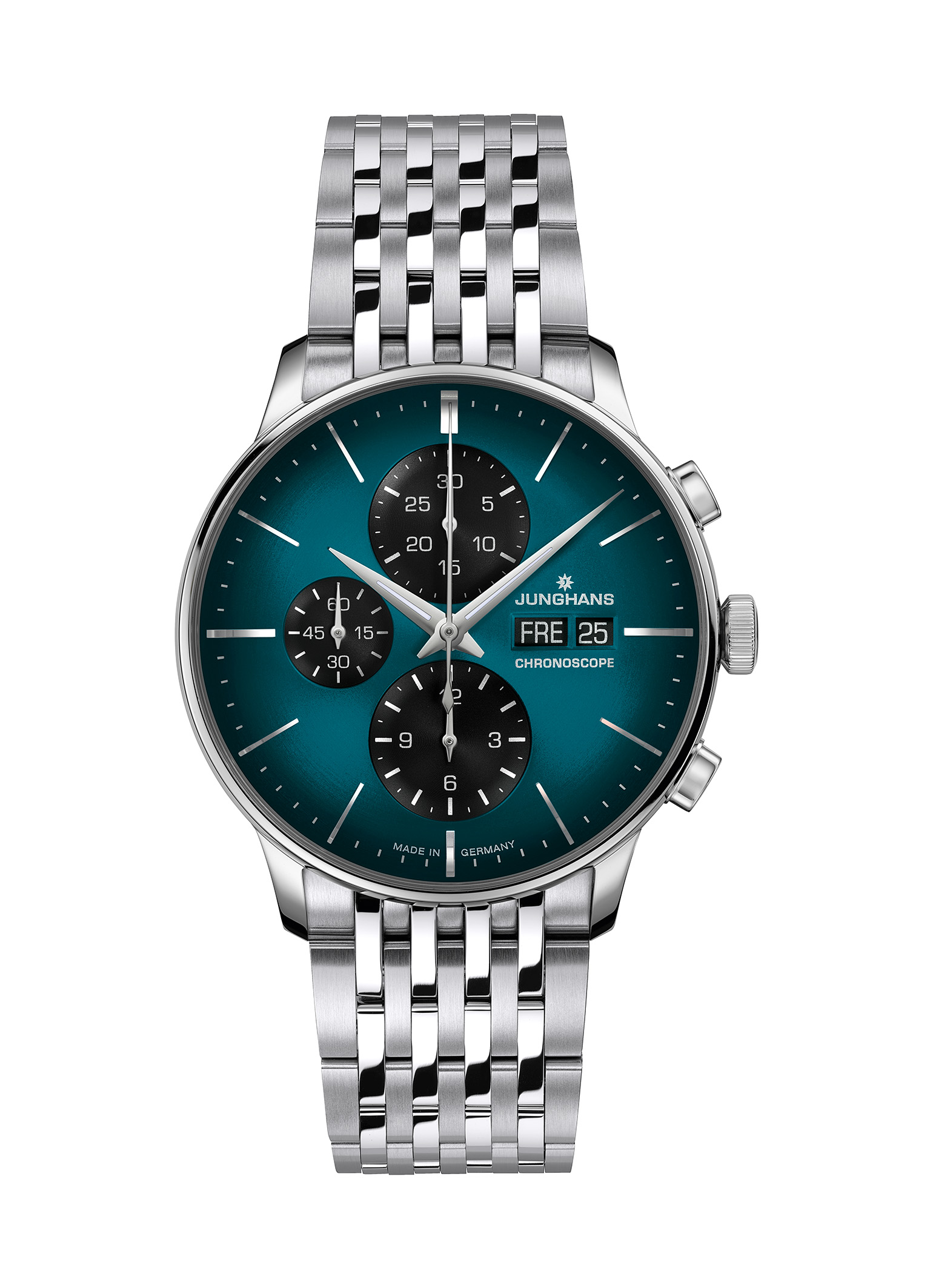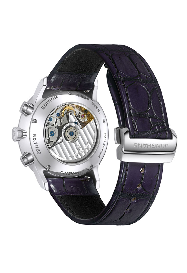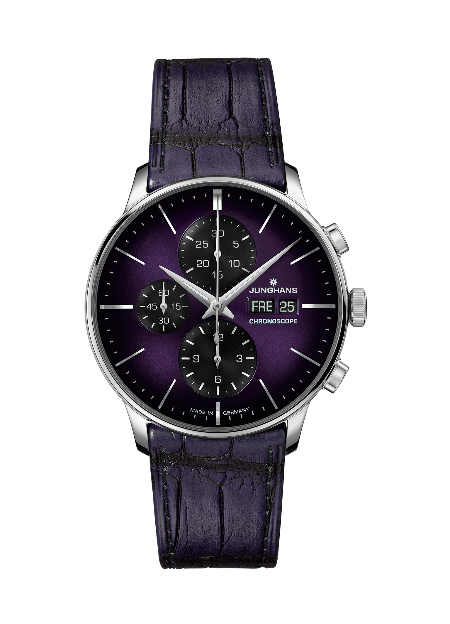 Echte Eyecatcher sind die zwei brandneuen auf jeweils 150 Exemplare limitierten Meister Chronoscope Automatikmodelle. Die eine tritt besonders cool auf mit einem Rundschliff-Zifferblatt in Petrol und starkem Edelstahl-Gliederband. Die andere setzt auf Extravaganz. Ihr Zifferblatt überzeugt in einem dunklen Violett – ebenso wie das Alligatorband. Die Meister Chronoscope trifft immer den Zeitgeist. Sie repräsentiert einerseits Junghans-Tradition, steht andererseits für moderne Technik, gestalterische und handwerkliche Exzellenz.