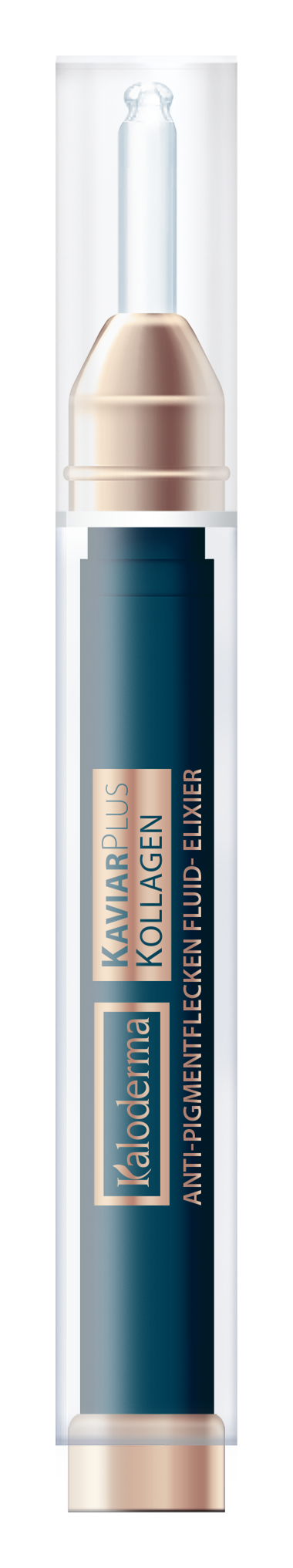 Das KaviarPlus Kollagen Anti-Pigmentflecken Fluid-Elixier von Kaloderma wirkt gegen Hyperpigmentierung und reduziert aufgrund seiner komplexen Inhaltsstoffe Pigment- und Altersflecken nachhaltig. Wichtigster Wirkstoff dabei ist die Regenbogenalge, die die Melaninproduktion nachweislich reduziert und so die Entstehung von neuen Pigmentflecken hemmen kann. Ein besonderer Applikator ermöglicht punktuelles Auftragen und sorgt für einen langfristig verschönerten Hautton. Ein besonderer Effekt in Sachen schöne Haut kann durch die Kombination des Anti-Pigmentflecken Fluid-Elixiers mit der Tagescreme aus der Kaviar-Pflegelinie erzielt werden.