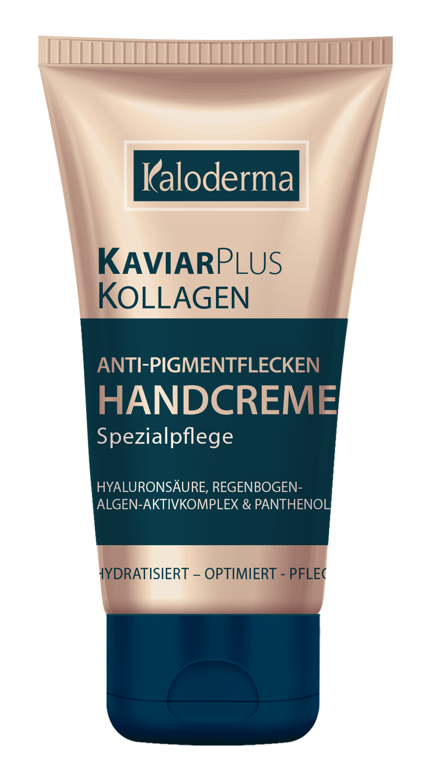 Die KaviarPlus Kollagen Anti-Pigmentflecken Handcreme von Kaloderma wirkt dank des Wirkstoffs der Regenbogenalge der Hyperpigmentierung direkt am Ursprung entgegen und kann das Auftreten von Pigment- und Altersflecken mindern. Kaviar-Extrakt, Algen-Extrakt, Regenbogenalge, Kollagen und pure Hyaluronsäure pflegen und schützen gleichzeitig vor sichtbarer Hautalterung. Klinisch getestet und von dem unabhängigen Institut Dermatest mit sehr gut bewertet. Mit der Kombination aus Tages-, Nacht- und Augenpflege sowie dem Serum, dem Anti-Pigmentflecken Fluid-Elixier und der Handcreme steht einer regenerierten, geschützten und gepflegten Haut nichts mehr im Weg.