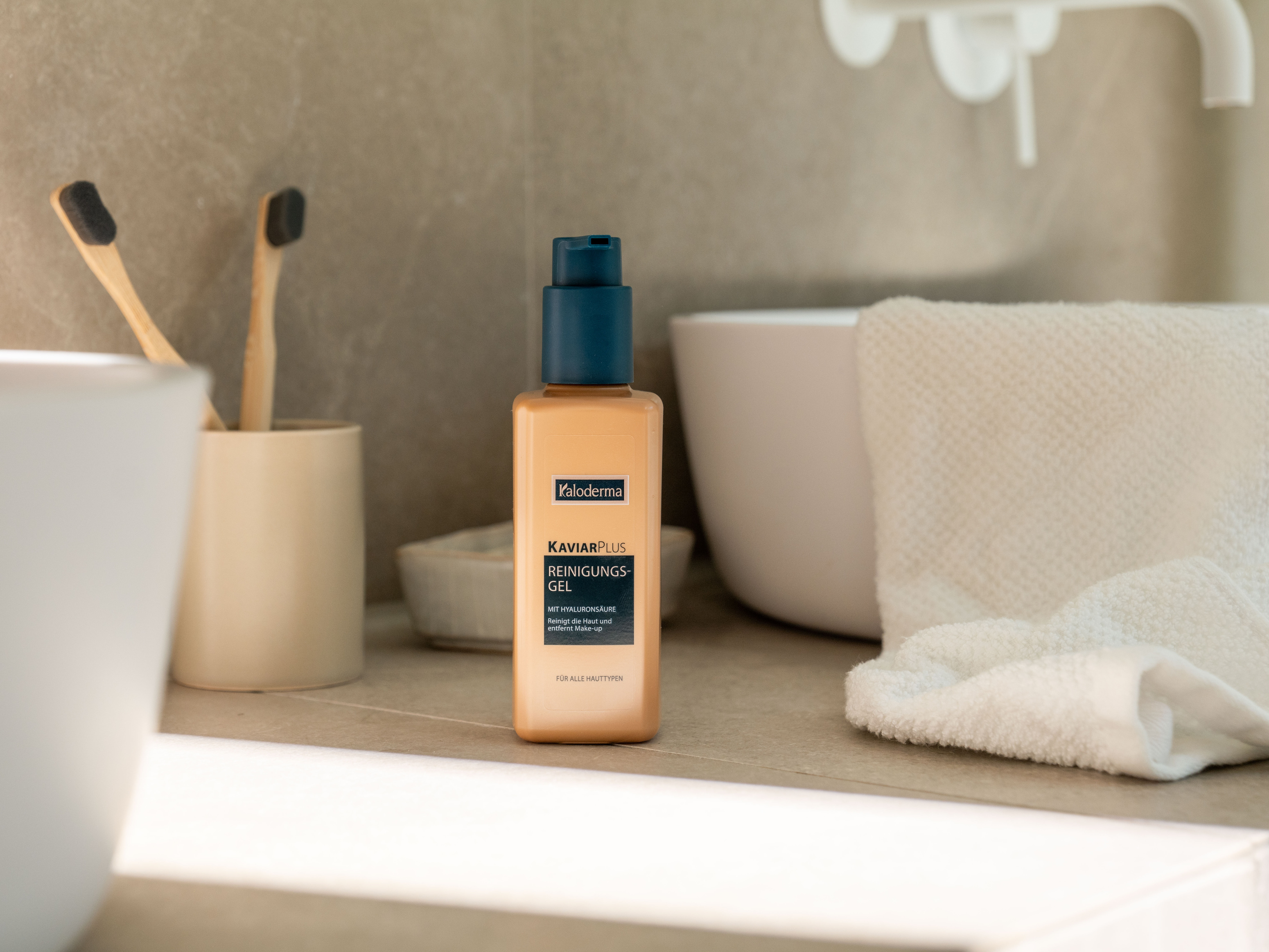 Ein frischer Start und ein grandioses Finale! Das milde KaviarPlus Reinigungsgel von Kaloderma ist wie ein täglicher Wellness-Urlaub für die Haut. Morgens, nach einer erholsamen Nacht, ist es Zeit für eine gründliche Reinigung, um die Haut von überschüssigem Talg zu befreien. Das KaviarPlus Reinigungsgel erfrischt die Haut mit einer sanften, aber tiefenwirksamen Formel, die die Hautbarriere nicht angreift, damit sie den Herausforderungen des Tages gewachsen ist. Abends, nach einem langen Tag, empfiehlt es sich dann die Haut von Make-up-Resten, Schmutz und Umwelteinflüssen zu befreien. Das KaviarPlus Reinigungsgel löst diese Verunreinigungen mühelos, sodass die Haut wieder frei atmen kann. Die milde Reinigung bereitet die Haut optimal auf die nachfolgende Pflege vor, indem sie die Poren klärt und die Haut beruhigt. So kann die Haut die wertvollen Inhaltsstoffe der Kaloderma KaviarPlus Kollagen Pflegeprodukte besser aufnehmen und sich im Schlaf regenerieren, damit am nächsten Tag wieder erfrischt in den Tag gestartet werden kann – natürlich mit dem KaviarPlus Kollagen Reinigungsgel.