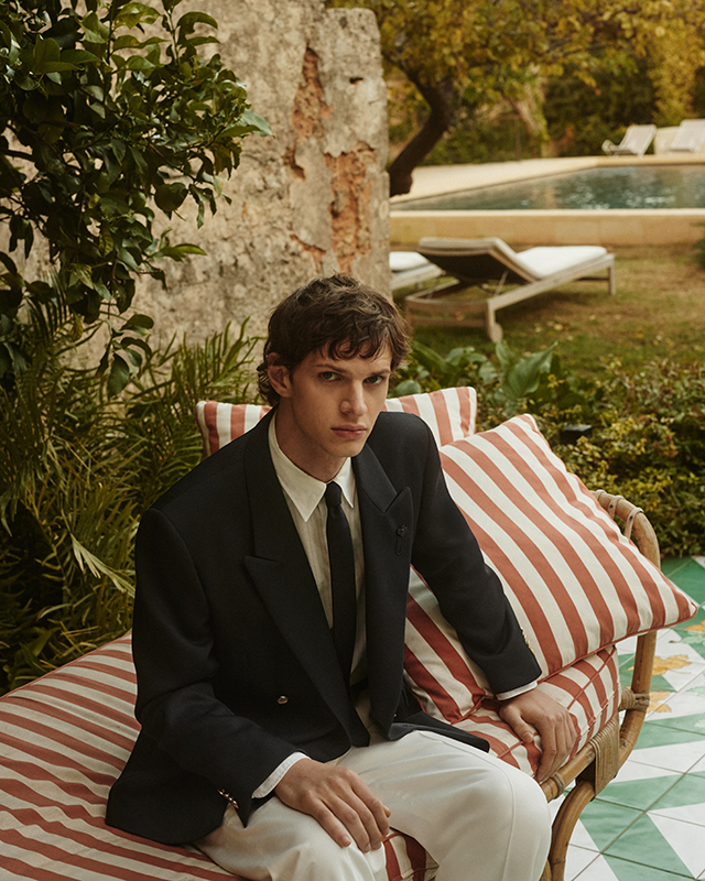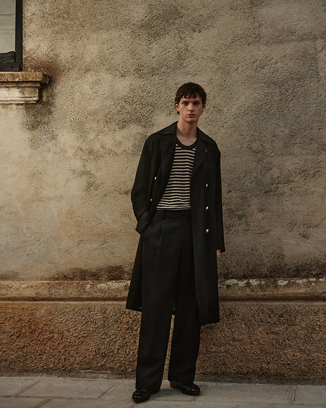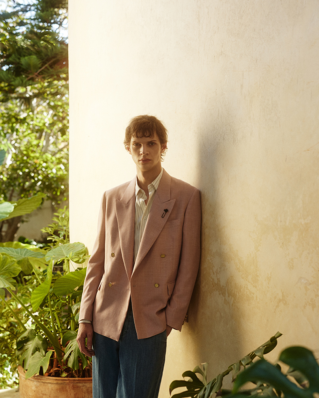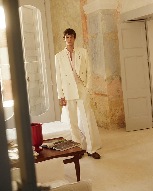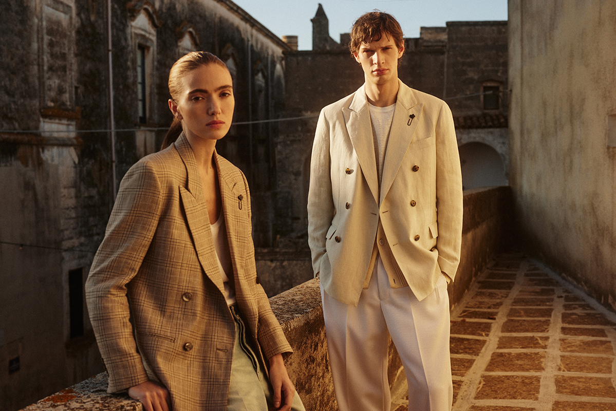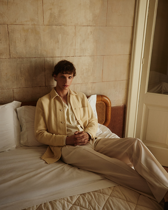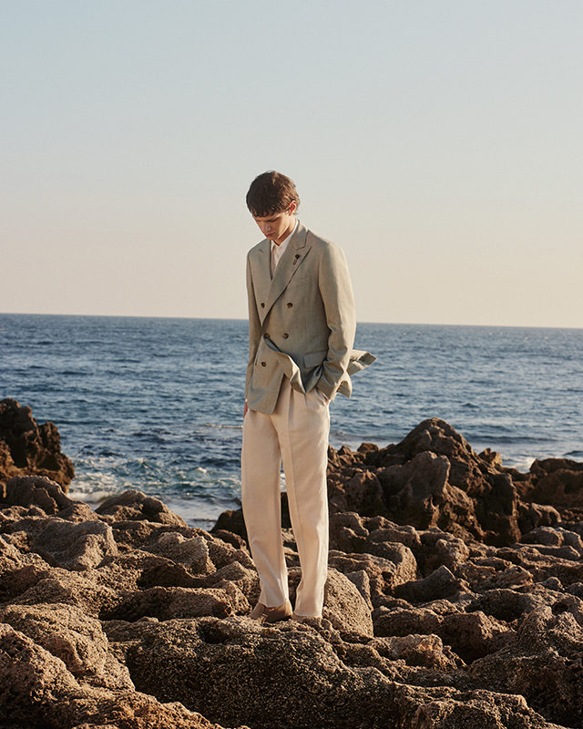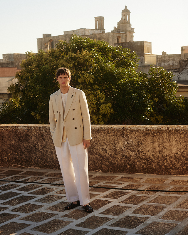 Linen, on its own or in blends with silk and wool, wool cavalry in soft weights, cotton fabrics of varying weights, ultra-soft denim in blends with Tencel and volatile silk create a masculine silhouette that borrows a sense of free fluidity from women’s fashion: in the loose but not oversized overcoats; in the new tie combinations in the same tone as the shirt or even the jacket; in the unprecedented twinset of tops, polo shirts, and cardigans to be combined as you wish, when you wish: knitwear also plays an important role in this philosophy of relaxed, neat, calm style. The colour rainbow extends from black to tobacco and then transitions into navy blue, sage green, touches of antique pink or wisteria, milk white, cloud