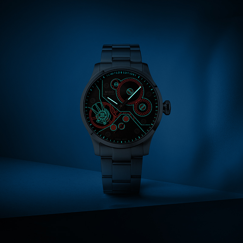 The Multifort Mechanical is a symbol of MIDO’s know-how and the magic of the fluorescent material makes its inner and outer excellence shine.