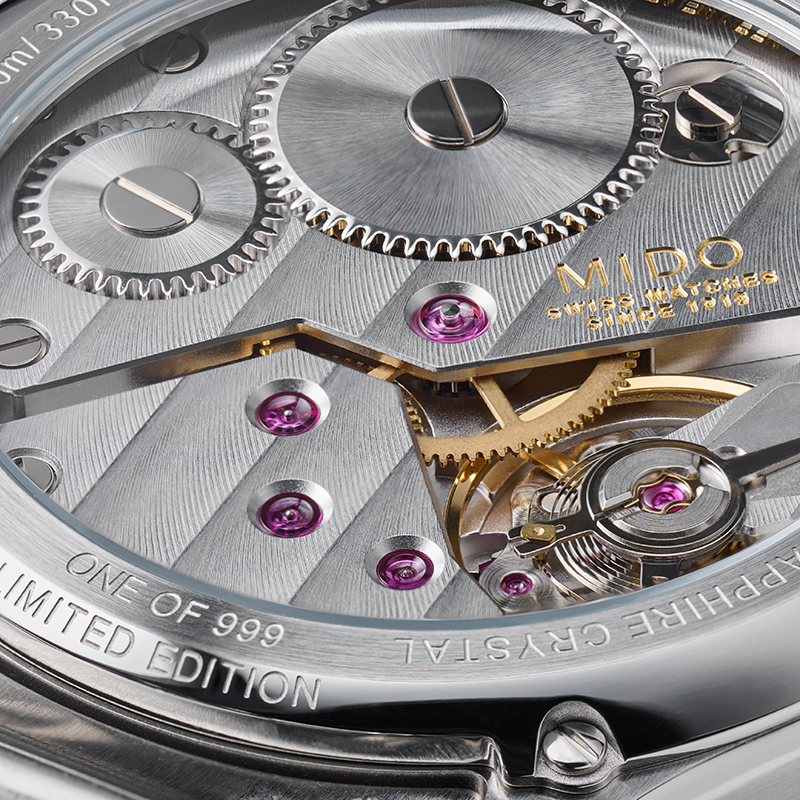 A transparent case back provides a clear view of the sophisticated gear train of the Multifort Mechanical. The components, artfully refined in keeping with tradition, are an expression of MIDO’s historical expertise. The rhodium-plated bridges, which are decorated with Côtes de Genève, are beveled on the edges. This hand-wound Swiss movement creates a strong emotional connection with the watch. With a power reserve of up to 46 hours, the owner supplies the movement with energy themselves – by simply turning the ergonomic crown on the side of the case. And then the pulsating, mechanical heart of the watch continues to beat to measure time with precision.