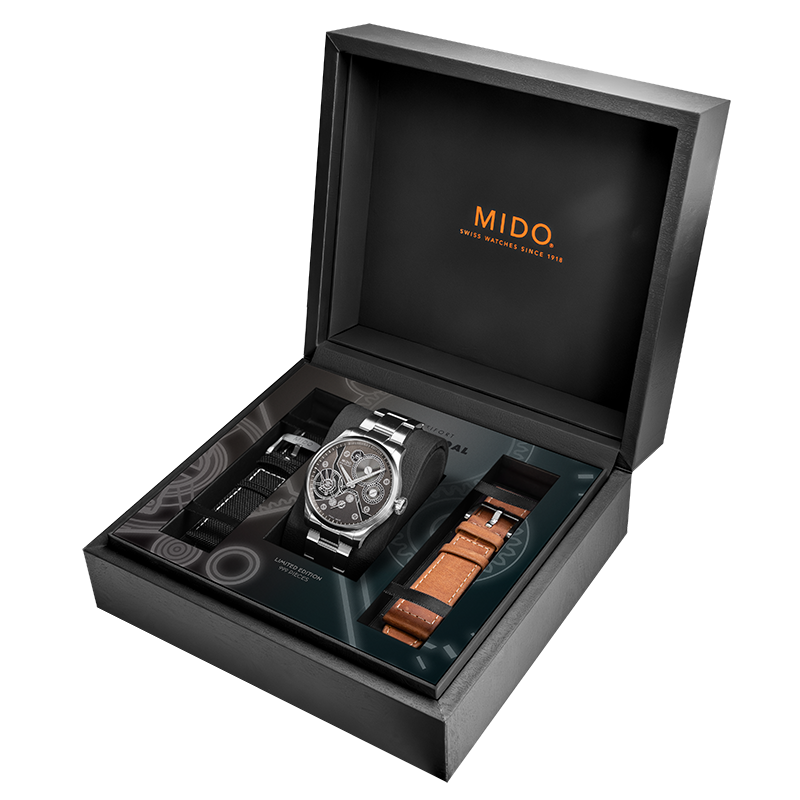 The strong personality of Multifort Mechanical combines expertise and history. The Multifort, launched in 1934, is MIDO’s oldest watch line. Crafted from the finest metals, this watch stands the test of time and the elements with legendary durability. With a diameter of 44 mm, the stainless steel case of the Multifort Mechanical underlines its exceptional strength of character. White Super-LumiNova® traces the shape of the movement’s components behind the scenes on the anthracite-colored dial – like an X-ray image. This high-tech phosphorescent material creates an extraordinary painting that glows blue and orange in the dark. On the caseback, a mineral crystal reveals the sublime refinements of the mechanical Swiss movement. MIDO has chosen a hand-wound movement that is extremely popular with collectors. By operating the crown, the owner of the watch interacts directly with the mechanical mechanism – in keeping with classic watchmaking tradition. The words “JUBILE” and “ONE OF 999” are engraved on the caseback of each example of this exclusive edition, limited to 999 pieces to mark Multifort’s 90th anniversary. With three interchangeable straps in a special case – made of brown leather, stainless steel and dark gray fabric with decorative stitching made of white luminous thread – the look of the watch can be easily adapted to suit the occasion.