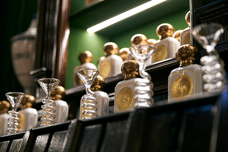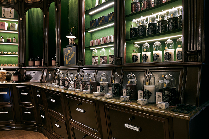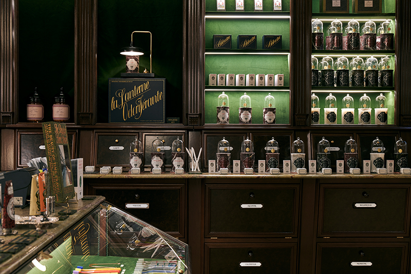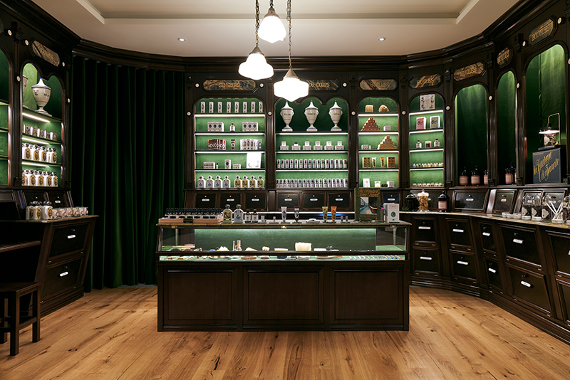 Die hohen Bögen und das Dekor der Holzschnitzereien an den Vitrinen wie in der ganzen Boutique sind eine Hommage an deutsche Architektur und Kunsthandwerk: Sie erinnern an die hohen Fenster im Maximilianeum, Sitz des Bayerischen Landtags, oder ans Jugendstil-Ambiente, das man in Münchens ehemaligem Bohème-Viertel Schwabing noch vielerort entdecken kann. Gehalten in warmen Grün-, Beige- und Holztönen, entwickelt die Officine diese einzigartige «atmosphère bavaroise», verbunden mit einer französischen Leichtigkeit.