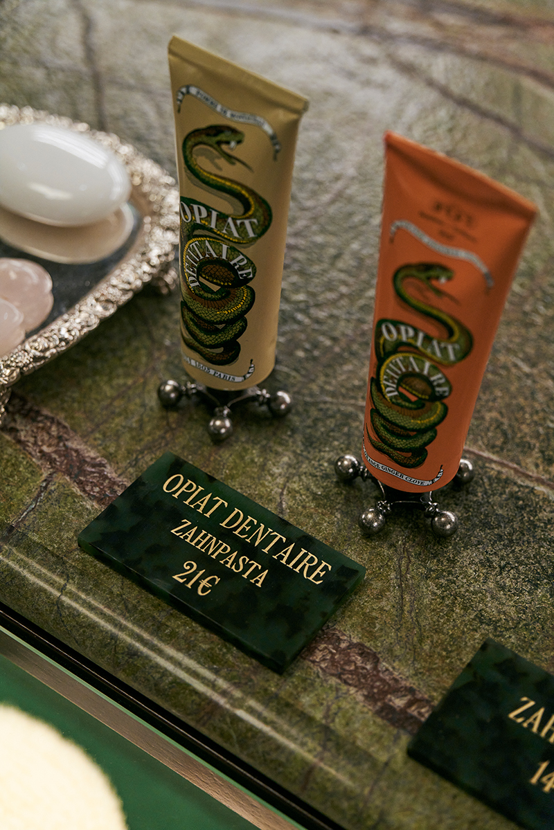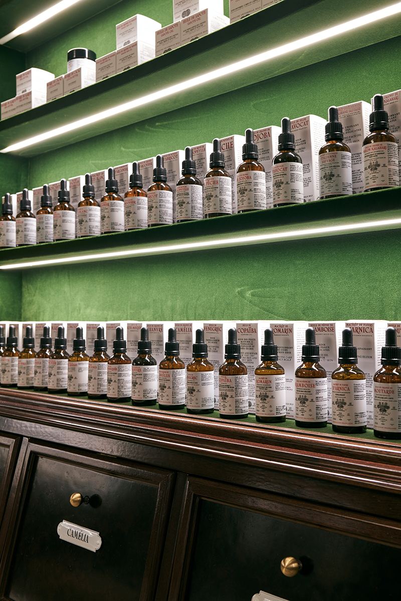 Ganz im Sinne des Hauses, erlaubt sich die Officine auch ein paar exzentrische Noten. Wie zum Beispiel das Spiel der schrägen Linien, in denen die Schubladen bis zum Boden tanzen – auch als kleiner augenzwinkender Verwandschafts-Verweis auf die neue Officine Universelle Buly in Mailand. Die Theken tragen « Green Forest », einen Marmor mit spektakulärer Musterung von Grün- bis in Gelbnuancen, eine Anspielung auf das viele satte Grün in und um München herum. Damit korrespondiert Samt und Loden, der so tief in der bayerischen Kultur verwurzelt ist. Marmorne Täfelchen mit goldenen Gravierungen der lateinischen Namen verschiedenen Ingredienzien weisen auf die vielen Pflegeprodukte in den Schubladen und Vitrinen. In insgesamt 2o mit Samt ausgeschlagenen Rundbögen liegt der Schatz der Officine Universelle Buly: Eaux Triples, feine Pflege-Duftöle für den Körper, ikonische Duftkerzen in ihren Marmorbehältnissen mit Glasglocke, besondere Zahnpflege und Pomaden, Puder und exklusive Gesichtspflege, dazu eine Reihe erlesener Beauty Tools wie zum Beispiel Kämme und Bürsten aus der ganzen Welt.