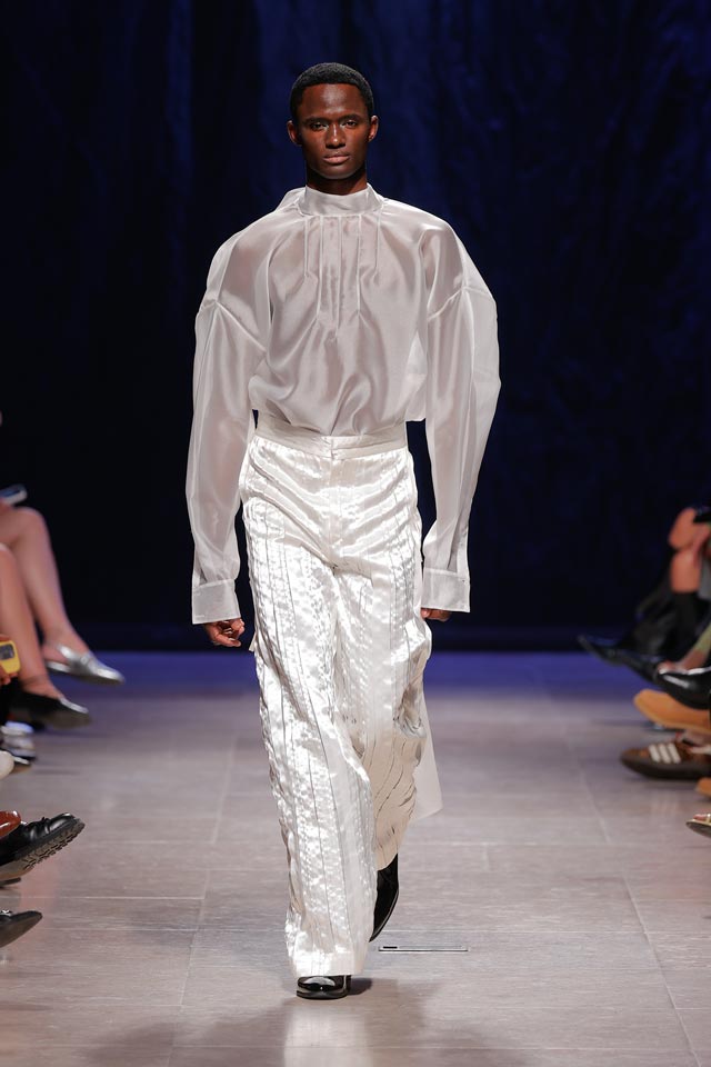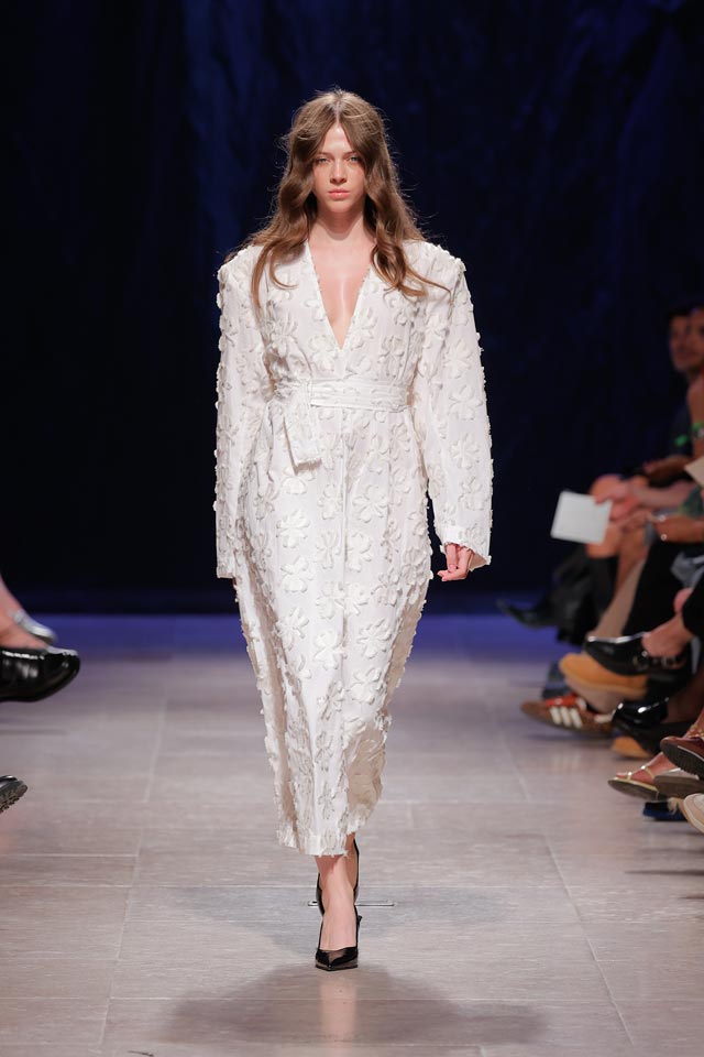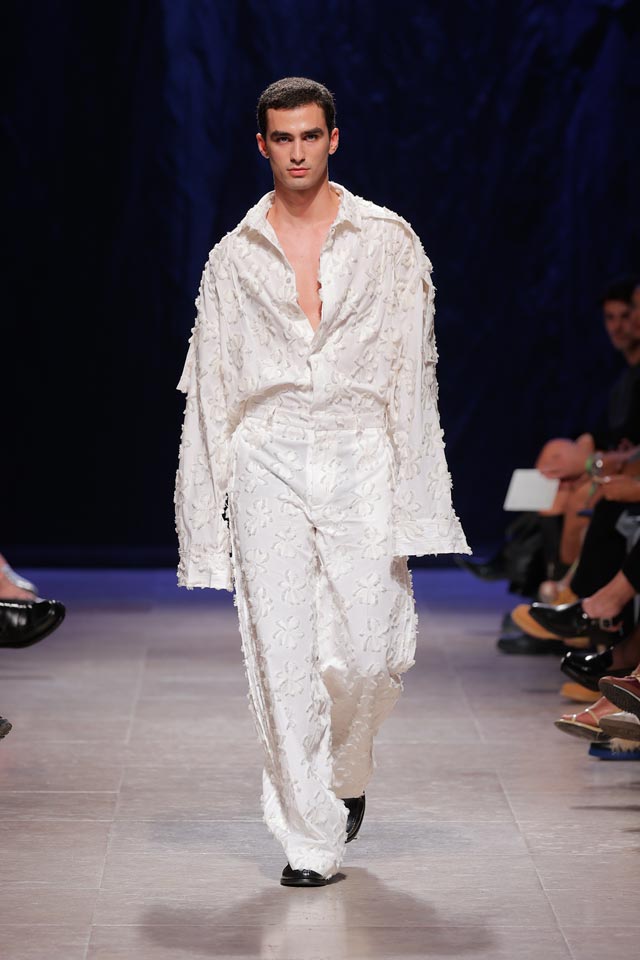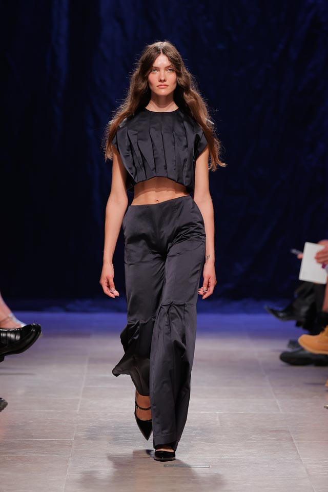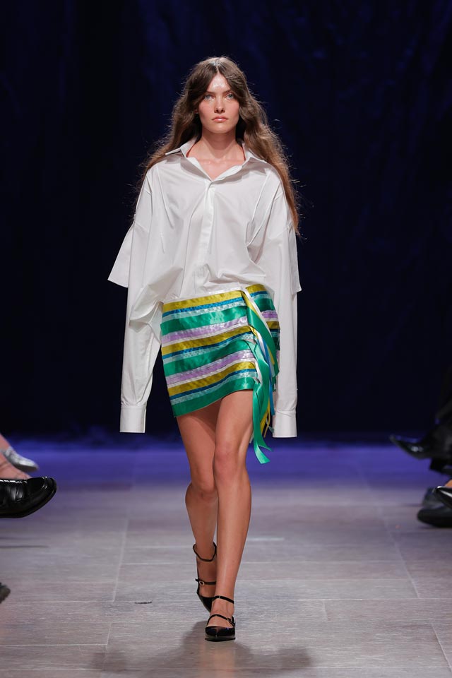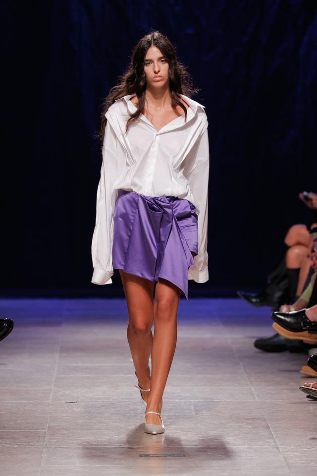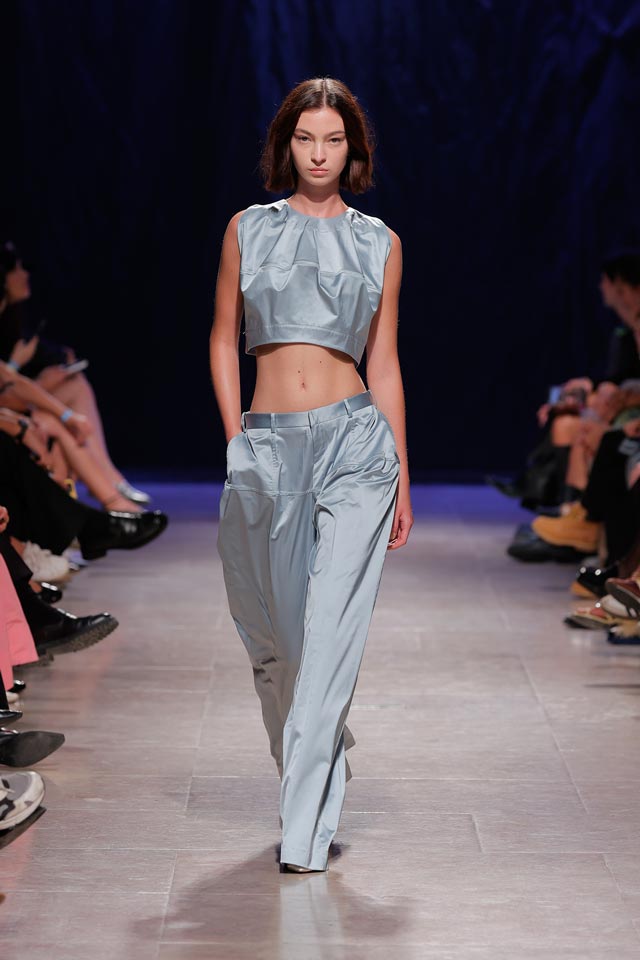 Maintaining our commitment to sustainability, more than 80% of the materials used come from deadstocks or recycled fibers. This is not just an environmental choice, but a design principle, allowing the stories of the materials to inform the collection’s narrative. Textural contrasts, between matte and glossy, stand out in structured cotton twills, luminous satins, and jacquards.