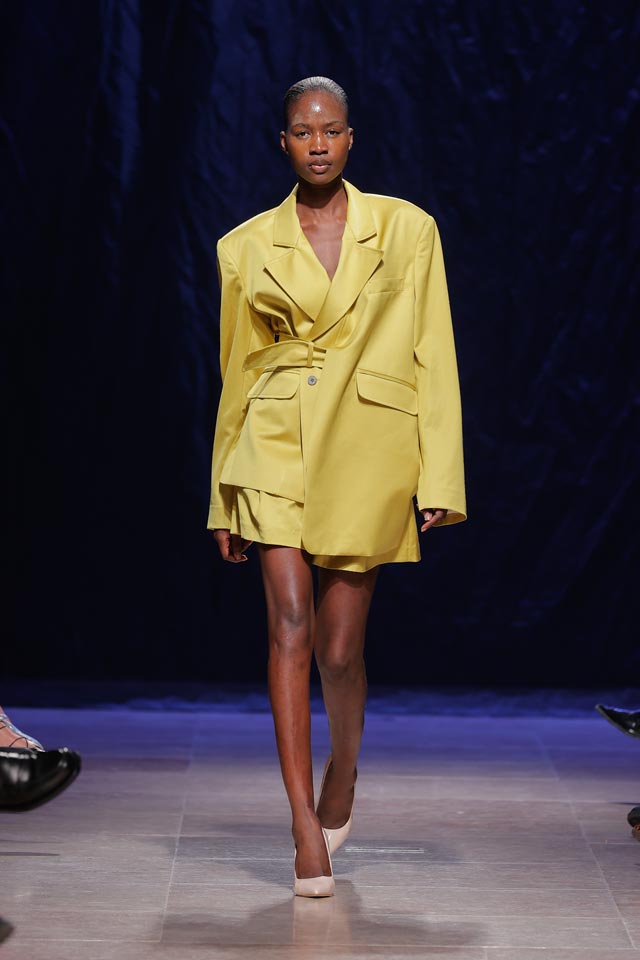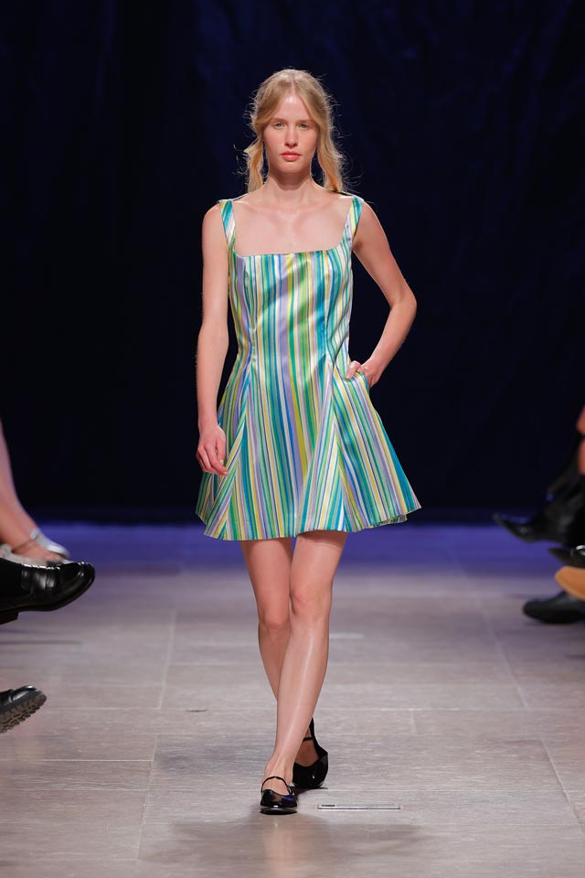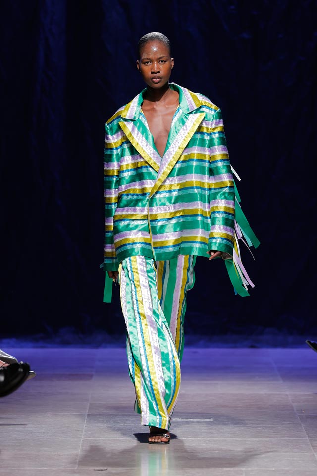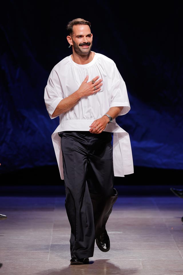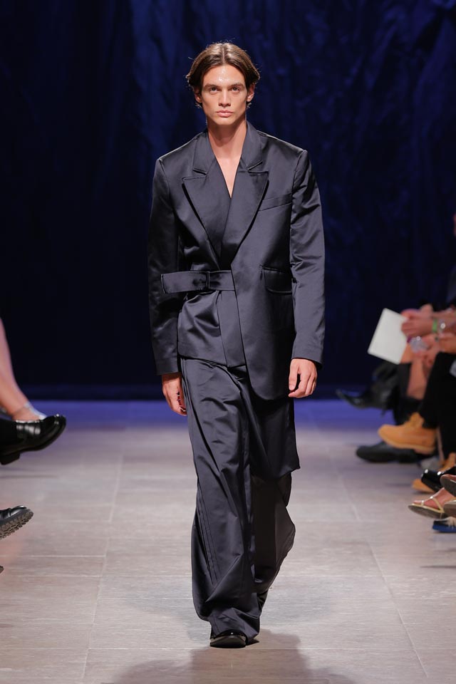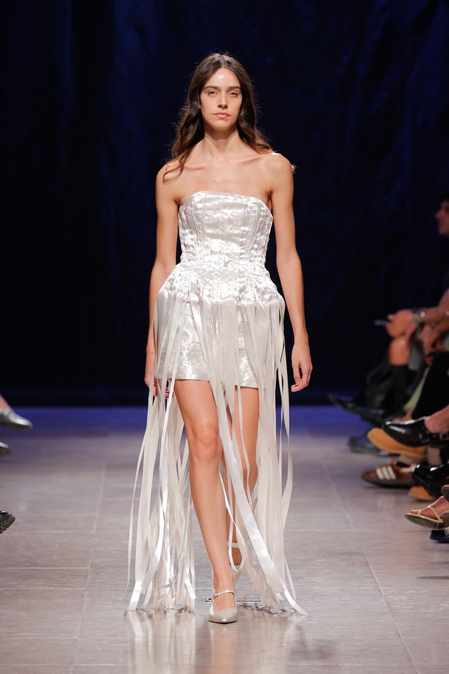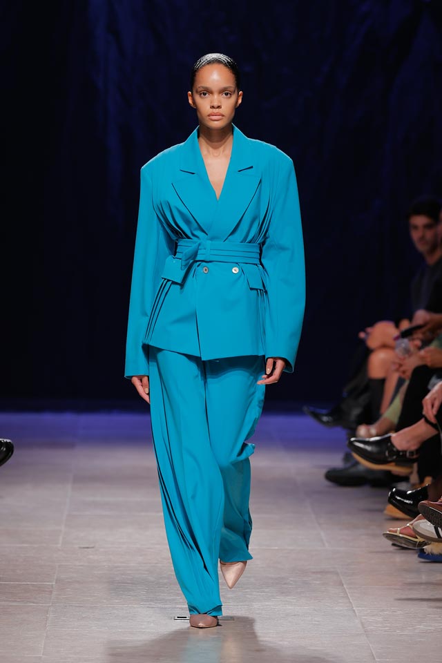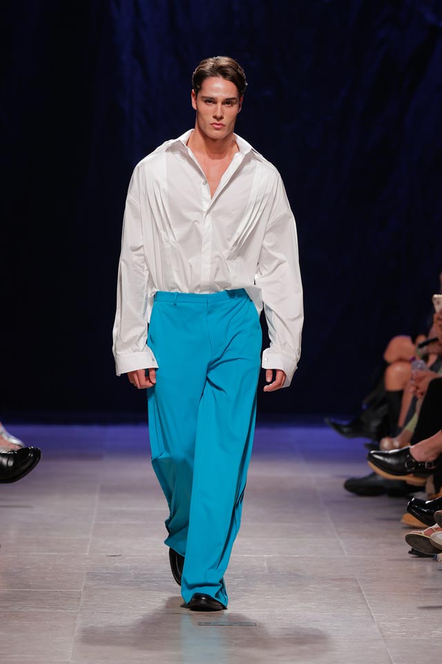 Maintaining our commitment to sustainability, more than 80% of the materials used come from deadstocks or recycled fibers. This is not just an environmental choice, but a design principle, allowing the stories of the materials to inform the collection’s narrative. Textural contrasts, between matte and glossy, stand out in structured cotton twills, luminous satins, and jacquards.