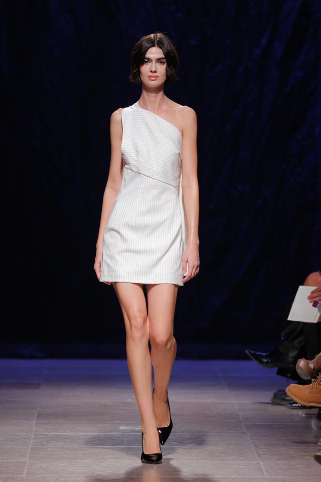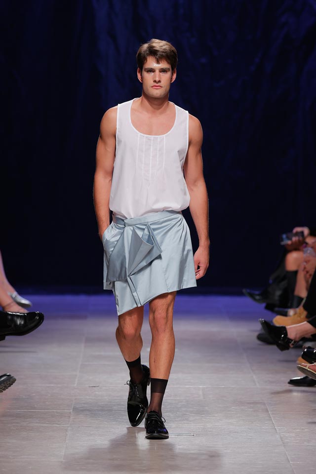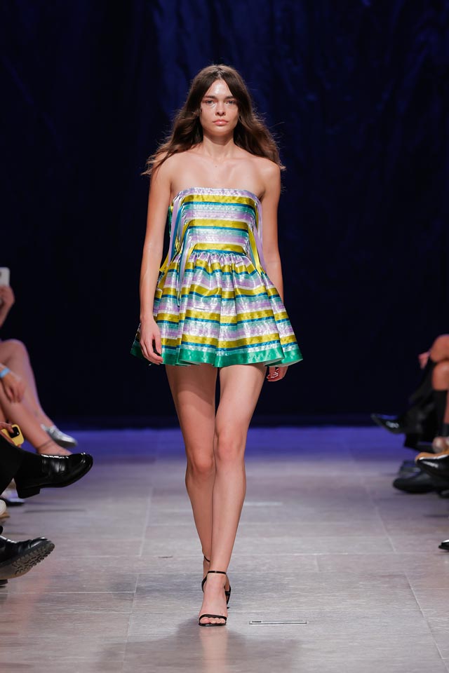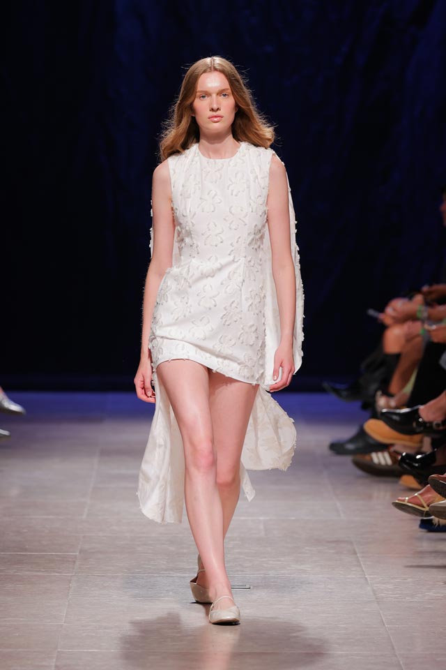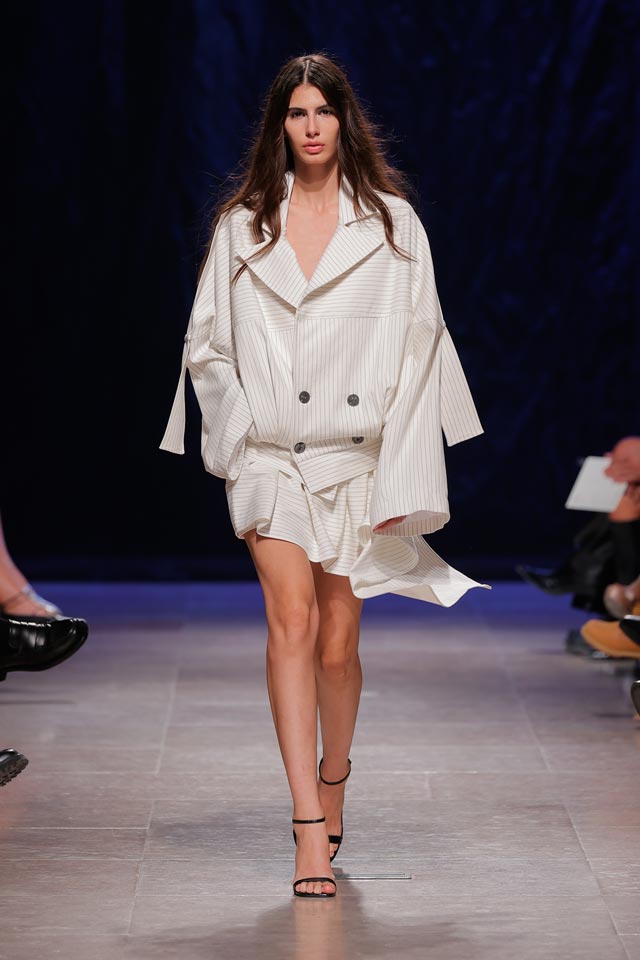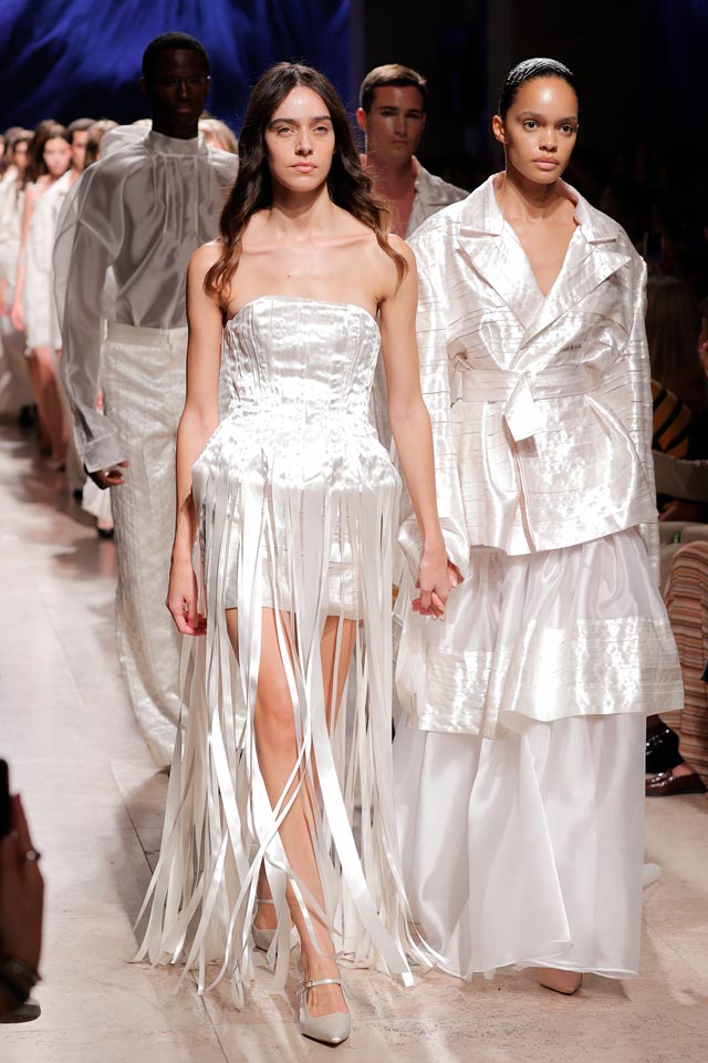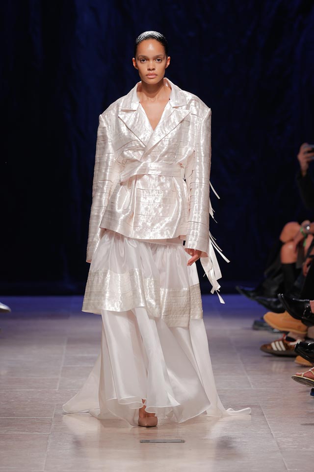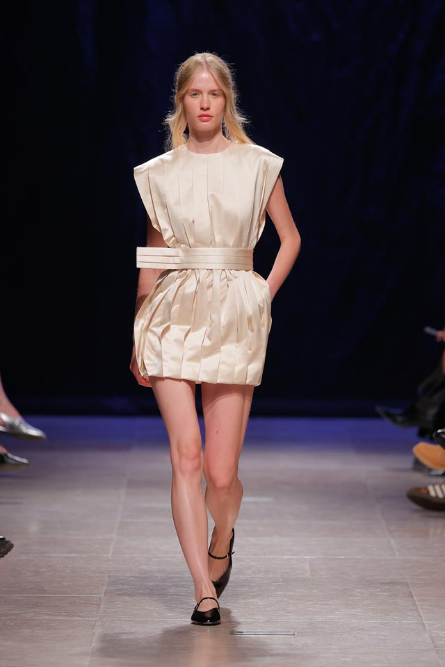 The collection’s foundation is a multi-layered composition, rich in movement, complexity, and authenticity. Each fold tells a story. Twisted pleats and ribs unfold like sculptural elements, suggesting intertwined bodies, gestures of intimacy made visible in form. A unifying line, sometimes structured, sometimes yielding to the flow, runs through the collection, appearing as horizontal bars that echo through the silhouettes. This visual rhythm evokes kinship, creating a harmonious dialogue between disparate parts.