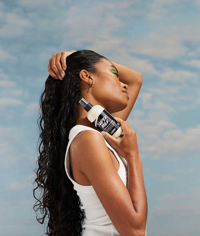 We sell the Super Milk Conditioner Spray worldwide every 63 seconds. The trio of nourishing almond, coconut, and oat milk softens and moisturizes hair—whether you’re on the go or on the third day after styling. Fresh lemon juice adds shine, and extra virgin olive oil nourishes and protects hair without weighing it down. It’s also perfect for refreshing waves, curls, and coils for the next day.