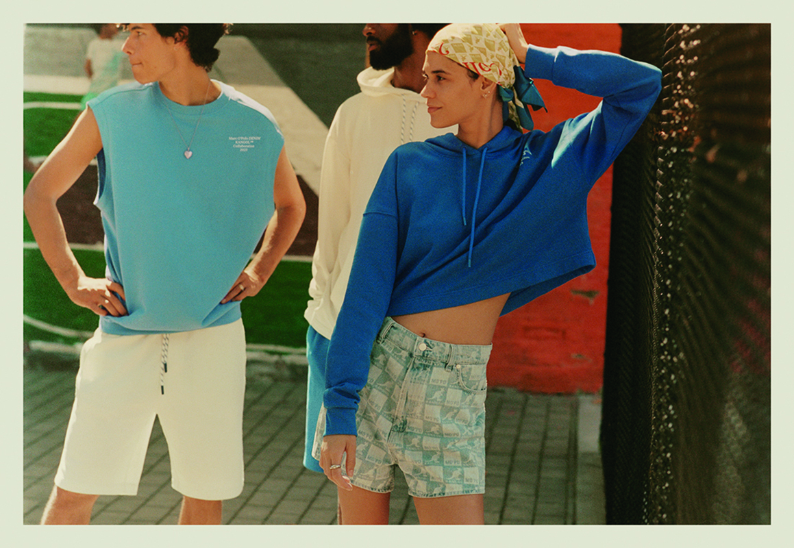 Denim Styles für Women und Men wie Jumper, Bandeau Top, Jacket und Shorts sitzen locker und gehören zum OUR CLEANEST JEANS PROJECT – Denims aus nachhaltigeren Rohstoffen, produziert unter verantwortungsvollen und ressourcenschonenden Färbe- und Waschverfahren.