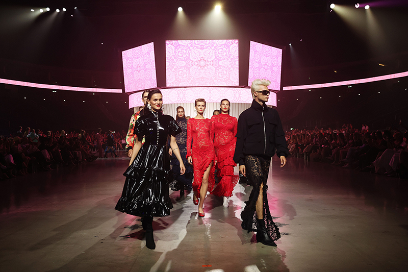 BERLIN, GERMANY – JULY 02: Models walk the runway at the COLLECTIVEFOUR Marcel Ostertag fashion show during Berlin Fashion Week SS26 at Uber Arena on July 02, 2025 in Berlin, Germany. (Photo by Matt Jelonek/Getty Images for Marcel Ostertag)
