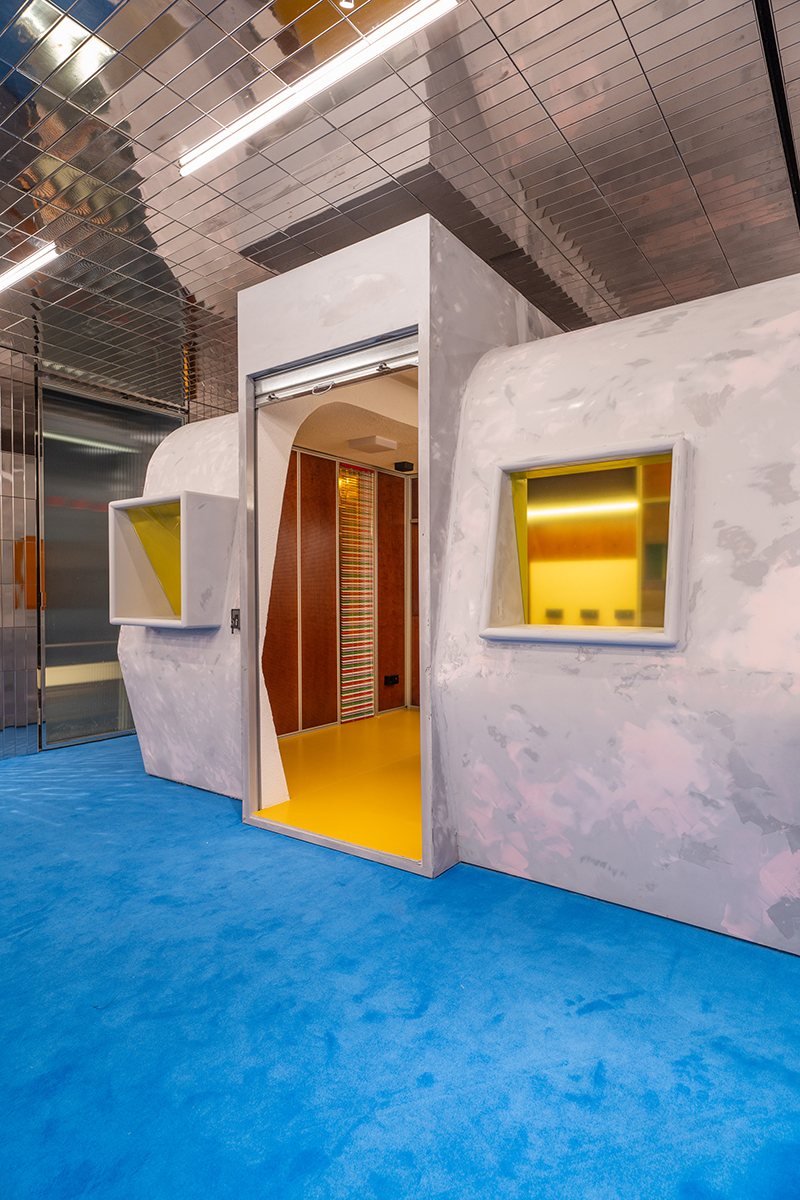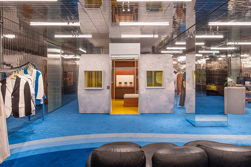 The modular layout presents, at its core, a fascinating, disruptive element: a “vessel for creativity”, a stand-alone installation not necessarily devoted to retail. Intersected across the three levels and accessible from the second floor, this surprising incubator, designed by The Wilson Brothers and Brinkworth in close dialogue with Francesco Risso, appears from the outside like a mobile home and will periodically be offered to different talents as a creative studio.