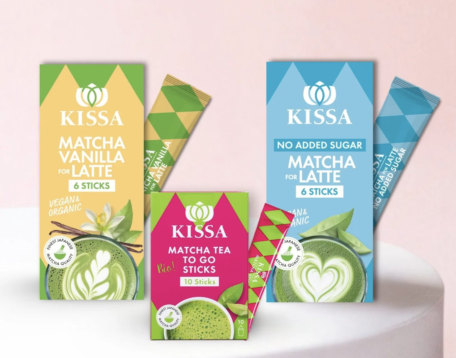 KISSA Matcha Beauty verwöhnt mit mild-süßlicher, fruchtiger Note und besonders vielen Antioxidantien. KISSA Matcha Focus punktet mit extra L-Theanin für Konzentration, Ruhe und Klarheit, begleitet von feiner Röst- und Nussnote. Alle Produkte sind 100 % bio, vegan, frei von Zusätzen und stammen aus nachhaltigem, biologischem Anbau in Japan.