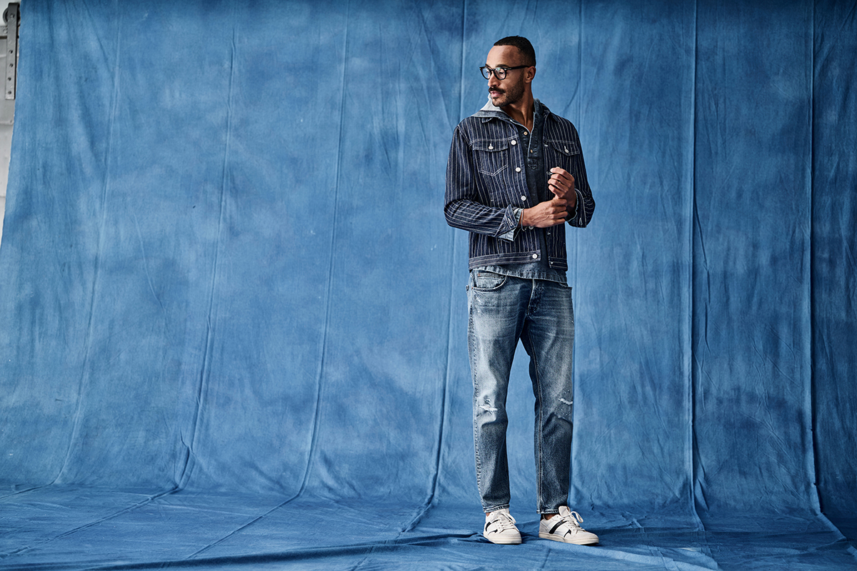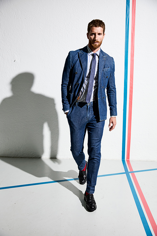 Stil: unverwüstlich modern. In diesem Anzug kommen zwei Welten zusammen, wie sie verschiedener nicht sein können. Die formelle Präsenz des Zweireihers trifft auf den indigoblauen Arbeiterstoff. Das ist Klassik mit Wucht, Business mit Freigeist, Eleganz mit der Aura des Rebellischen. Und es wirkt wie Denim vom Schneider aus Nîmes (= de Nîmes). Zusammengenäht ohne Schnörkel, pur, authentisch, im Ergebnis überraschend. Der Stoff ist dezent vorgewaschen, bereit, die persönlichen Prägungen folgender Abenteuer in sich aufzunehmen. Besondere Merkmale: zackiges Revers, Jeans-inspiriertes Knopfloch und solide Metallknöpfe.