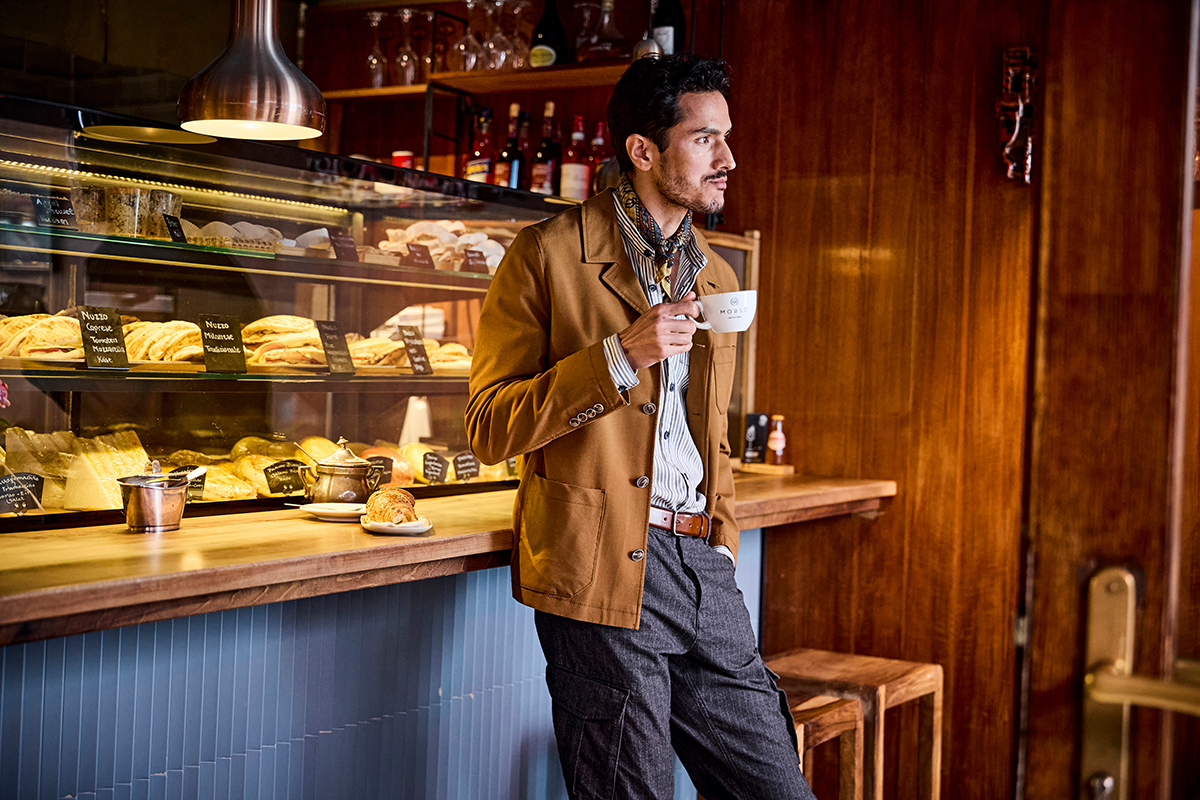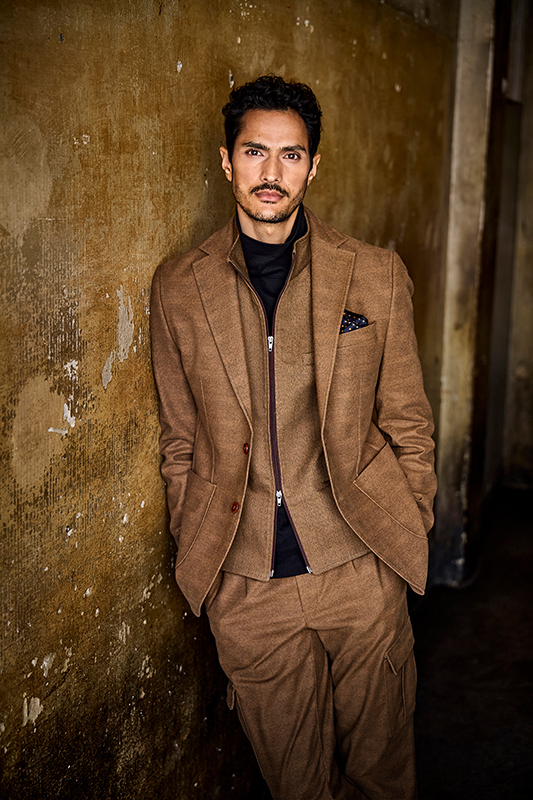 A suit with a difference. Its striking texture clearly indicates an Anglophile style. In the UK, we’d say crispy. Thanks to the special processing, the cotton displays a subtle pattern that is reflected in the jacket’s lining. Craftsmanship details like the buttoned collar tab seem like they’ve come from Savile Row, London’s hotspot for tailored suits. The combination with cargo trousers is new – reminiscent of the origins of industrialization. Equally surprising is the completion with a waistcoat made of the same fabric. It forgoes traditional buttons in favor of a zipper. The bottom line is that these individual pieces create a suit with British DNA and urban innovation.