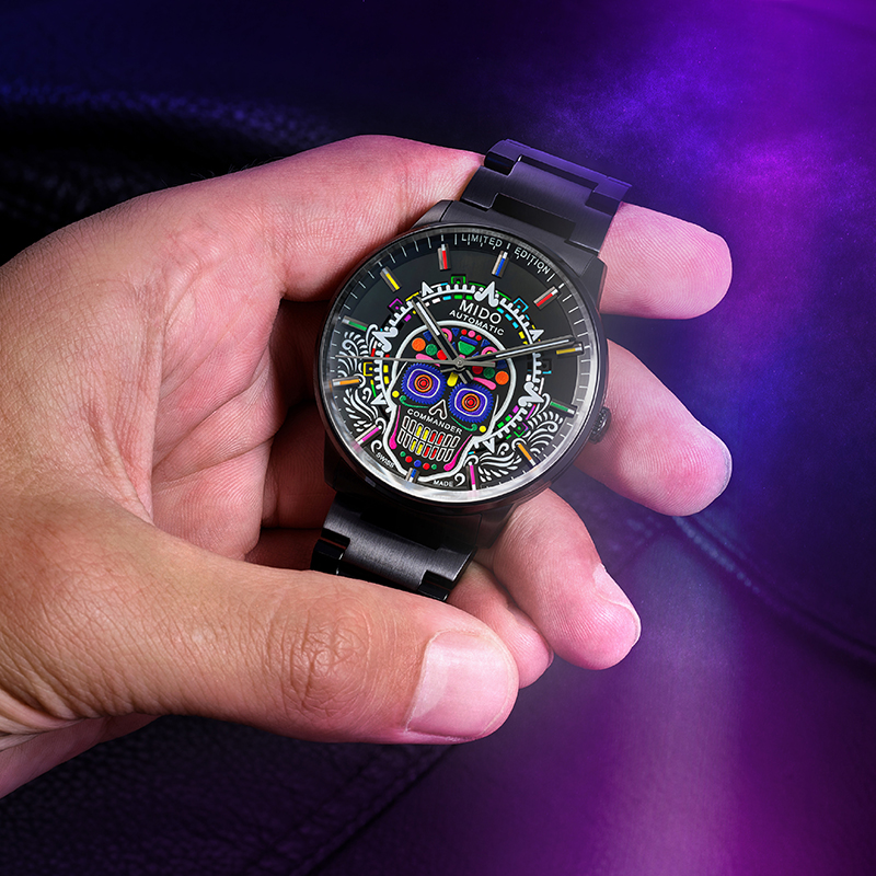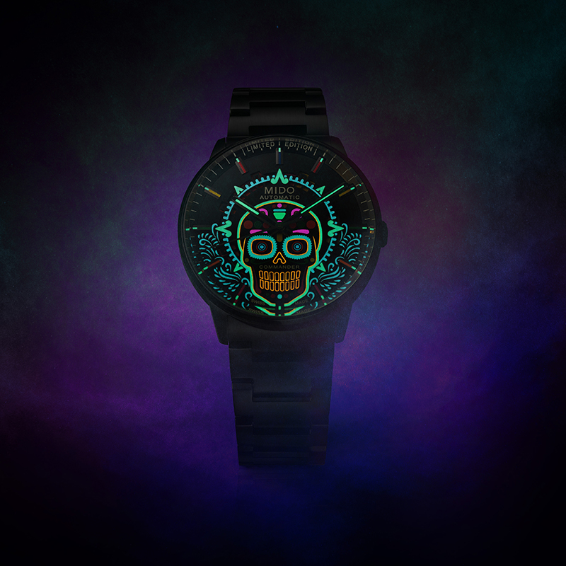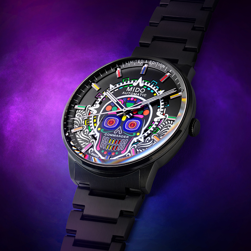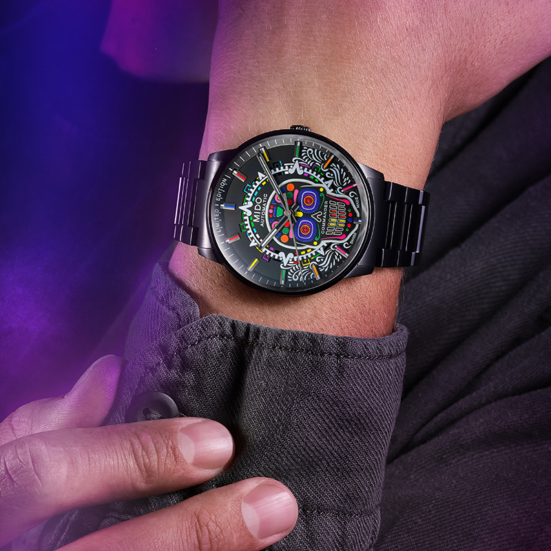 This exceptional limited edition ticks to the rhythm of the 80 caliber with the latest technical innovations. A hairspring made of NivachronTM, which is particularly resistant to shock and magnetism, combined with a power reserve of up to 80 hours ensure excellent reliability. MIDO has also decided to finely decorate the oscillating weight of this Swiss automatic caliber, which is also engraved with the MIDO logo, with traditional Geneva stripes. The Commander “Circulo de Luz” Limited Edition celebrates the passage of time as a colorful celebration in honor of Mexico’s Día de Muertos.