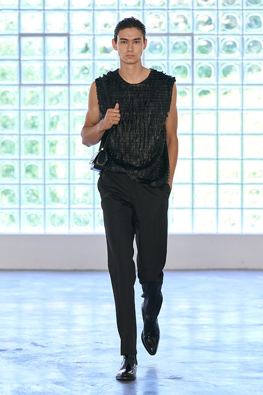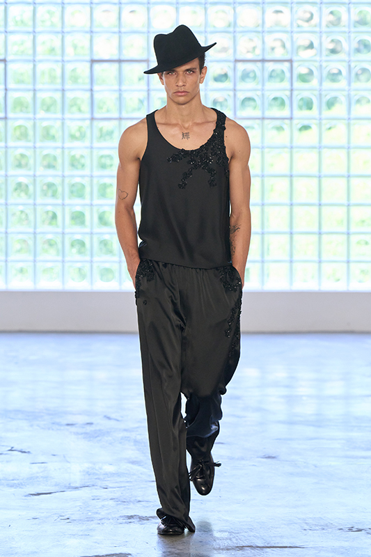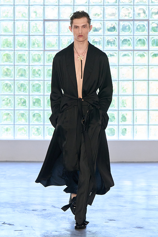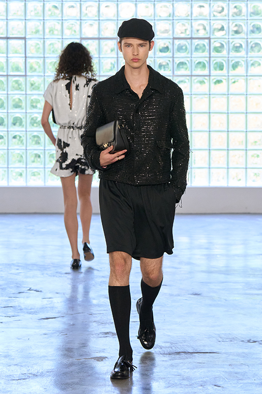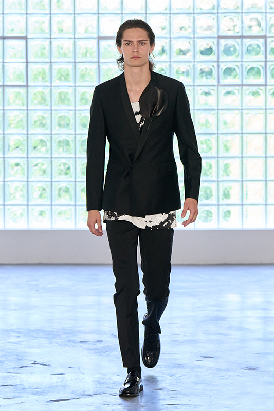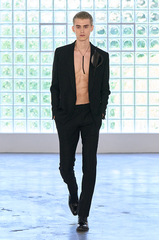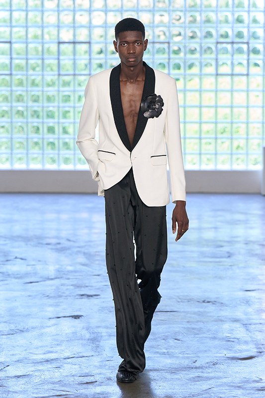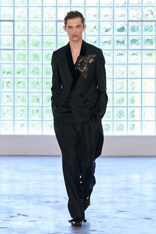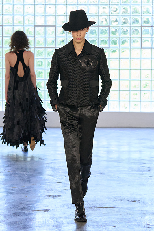 In the men’s proposal, the structured and precisely cut pieces come to life with embroidered applications in black beads that form camellias and leather calla lillies – elements that refer to nature reinterpreted with contemporary rigor. Shoes adorned with charms and necklaces in black metallic mesh add a touch of elegant rebellion, always remaining within the register of refined sobriety.