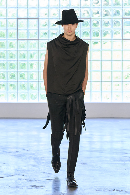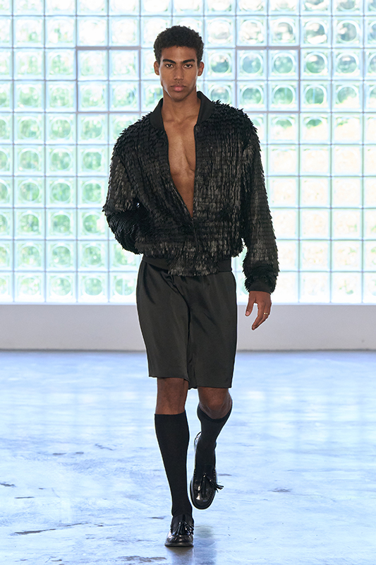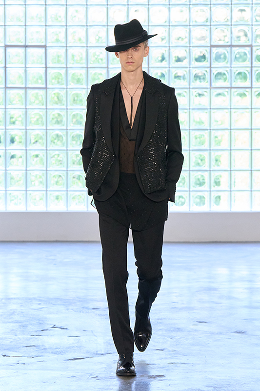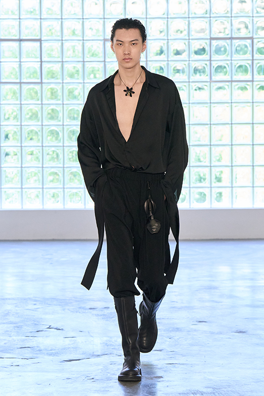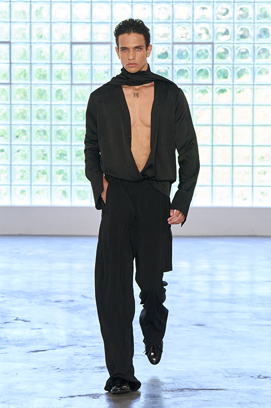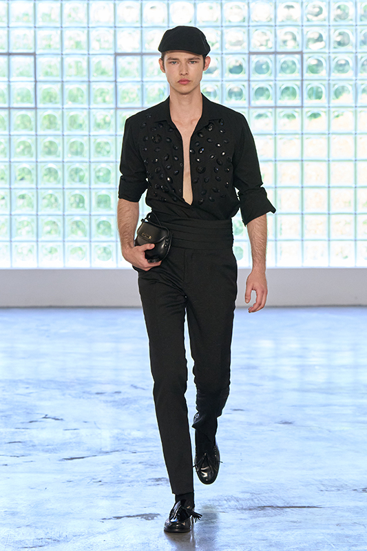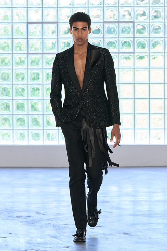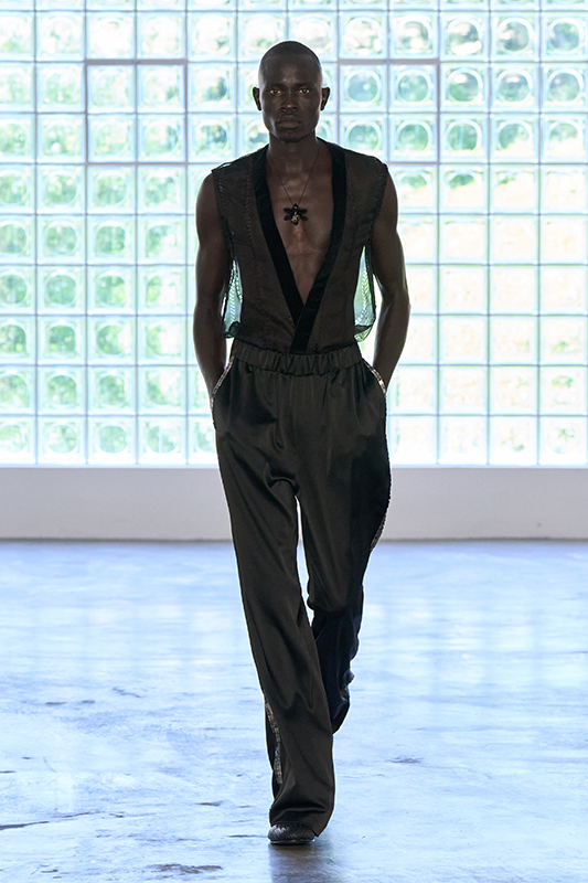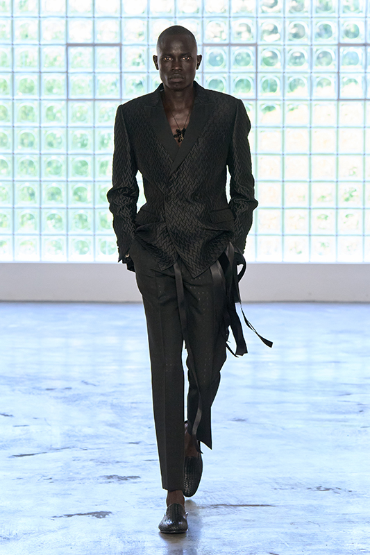 In the men’s proposal, the structured and precisely cut pieces come to life with embroidered applications in black beads that form camellias and leather calla lillies – elements that refer to nature reinterpreted with contemporary rigor. Shoes adorned with charms and necklaces in black metallic mesh add a touch of elegant rebellion, always remaining within the register of refined sobriety.