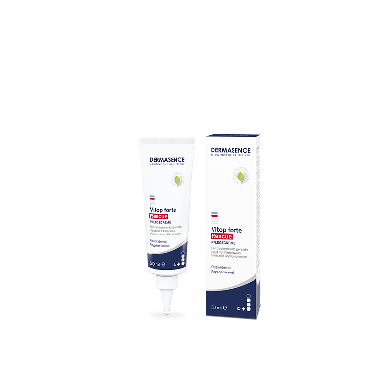 Und so sorgt die Akuthilfe für intensive Beruhigung mit Tiefenwirkung: Die DERMASENCE Vitop forte Rescue Pflegecreme imitiert die lamellare Struktur der Haut mit hautverwandten Lipiden, die die Feuchtigkeit einschließen und so dem Austrocknen der Hautzellen vorbeugen. Sie unterstützt damit den gesunden Aufbau der Hautbarriere. Die Creme versorgt die Haut intensiv mit hautidentischen Ceramiden, Cholesterol und pflanzlichen Ölen. Panthenol beruhigt und Niacinamid aktiviert die hauteigene Lipidsynthese zur Regeneration der Hautbarriere. Auch ein Feuchtigkeitskomplex mit Hyaluronsäure ist enthalten.