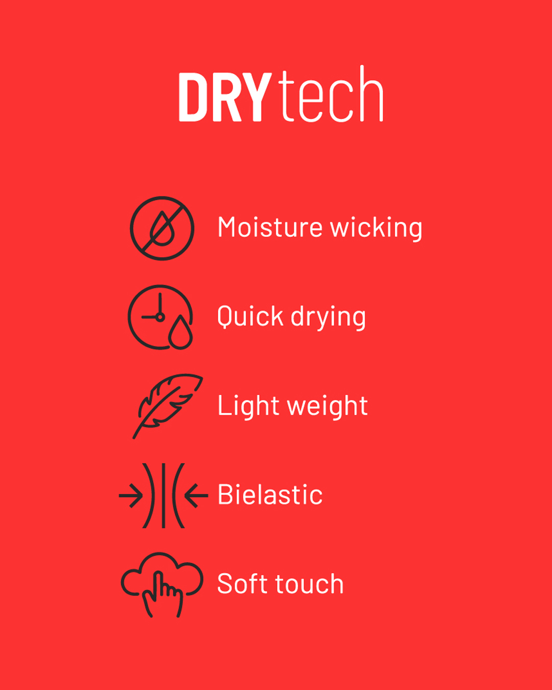 At the core of the Dry Tech Line is advanced bi-elastic, lightweight technical fabric. Each piece moves naturally with the body, providing unrestricted motion and targeted support where it matters most. Exceptionally soft to the touch, the material delivers a comfortable, second-skin feel while being durable enough to endure the most intense training sessions.