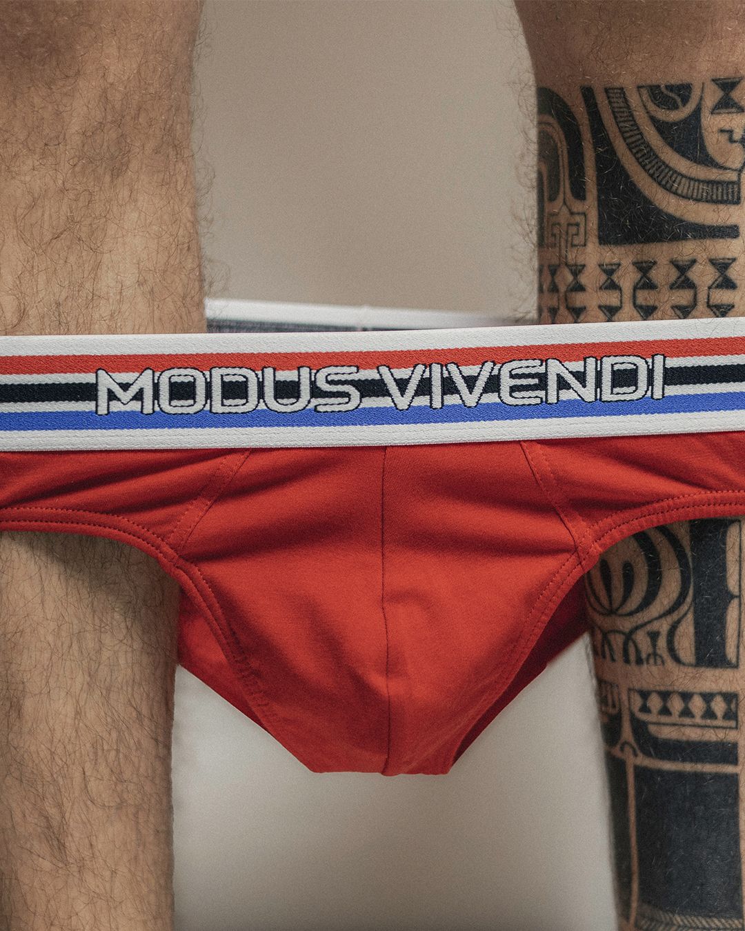 Crafted from premium pure knitted cotton with elastane, each piece delivers exceptional comfort, flexibility, and a true second-skin feeling. The designs feature a regular fit with a low-rise cut, enhancing both support and freedom of movement. At the core of the line is the signature jacquard waistband, boldly detailed with the MODUS VIVENDI embroidered logo and finished with classic stripes in red, blue, black, and white. A distinctive mark of identity that is clean, confident, and unmistakably athletic.