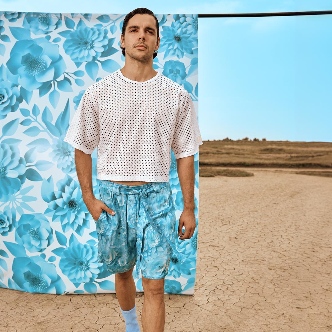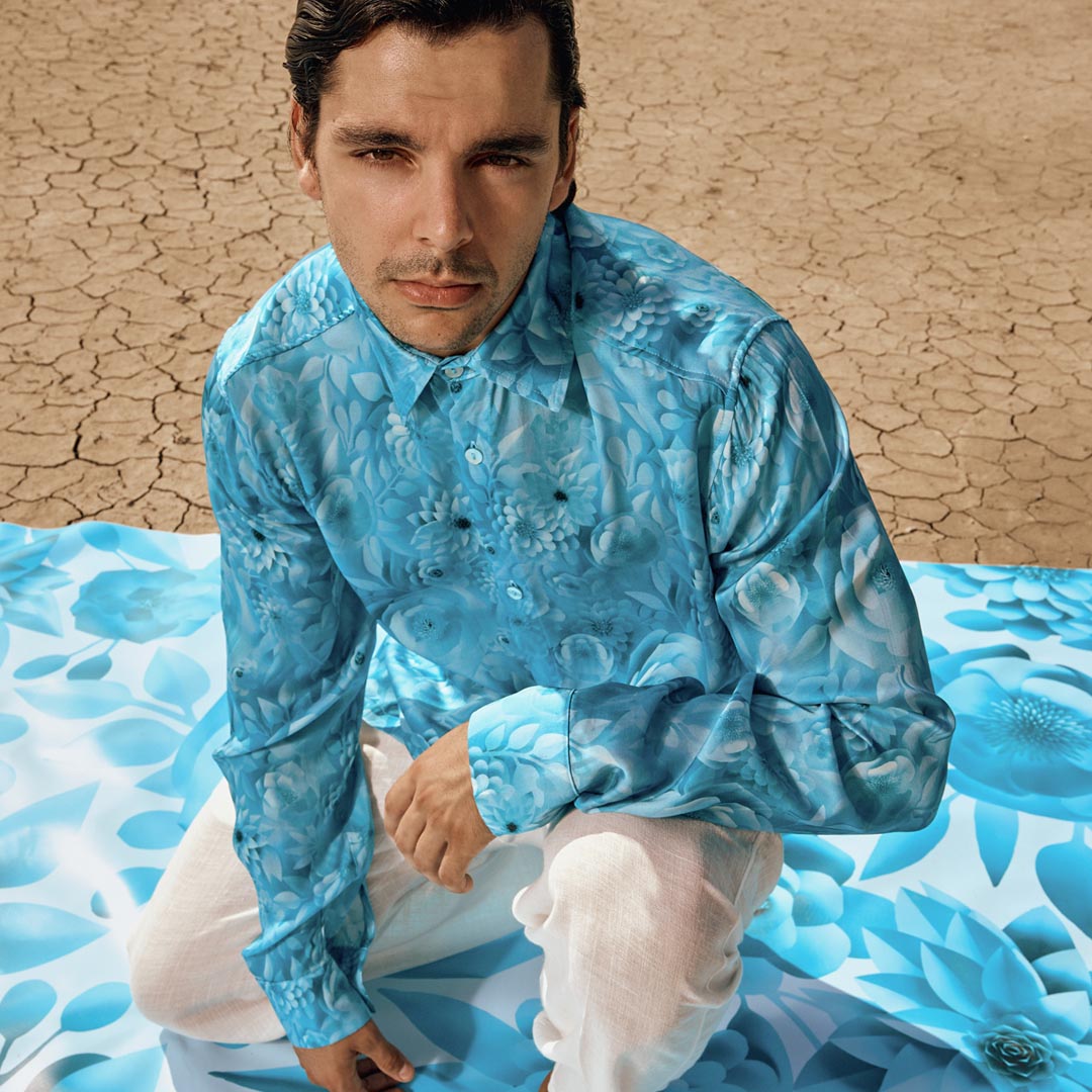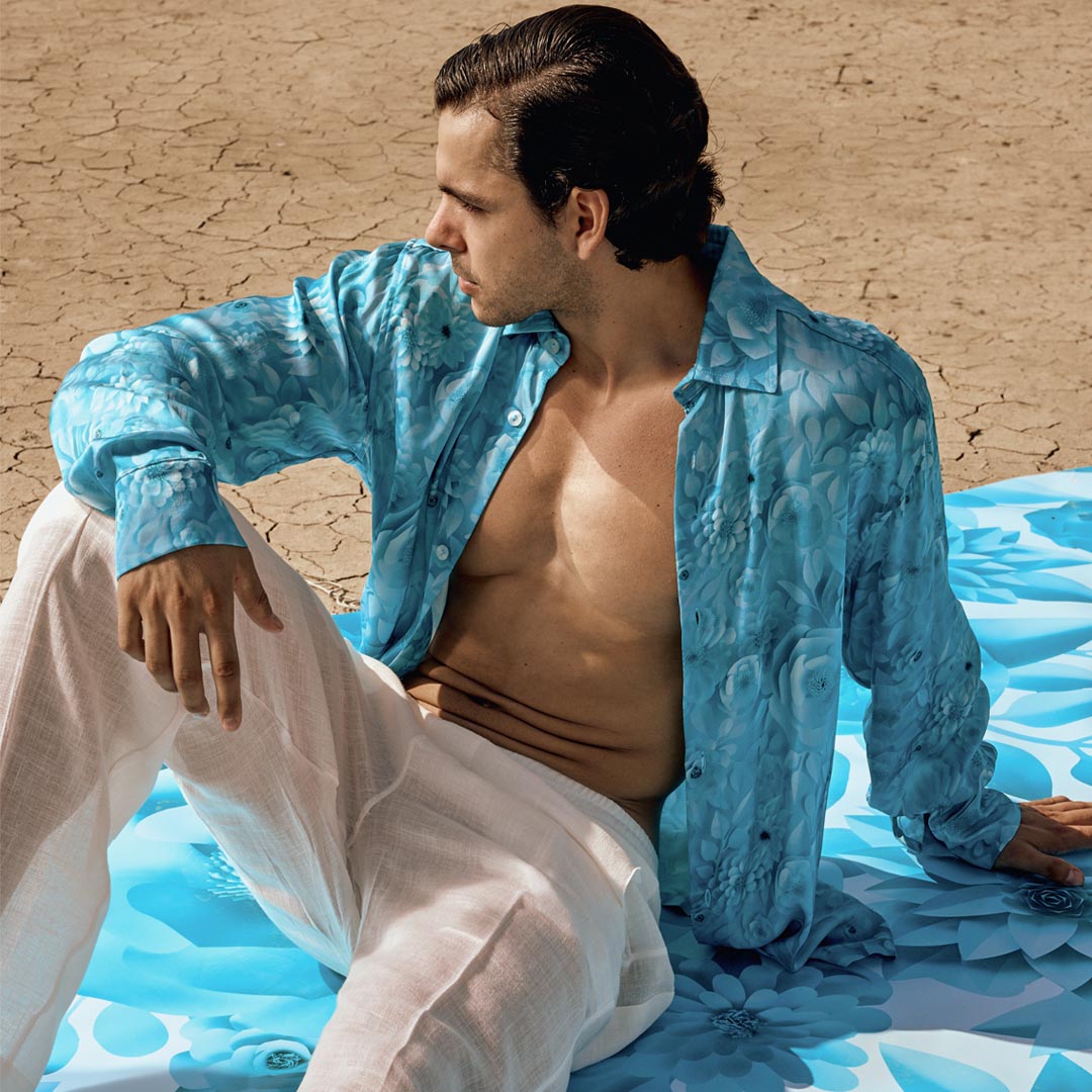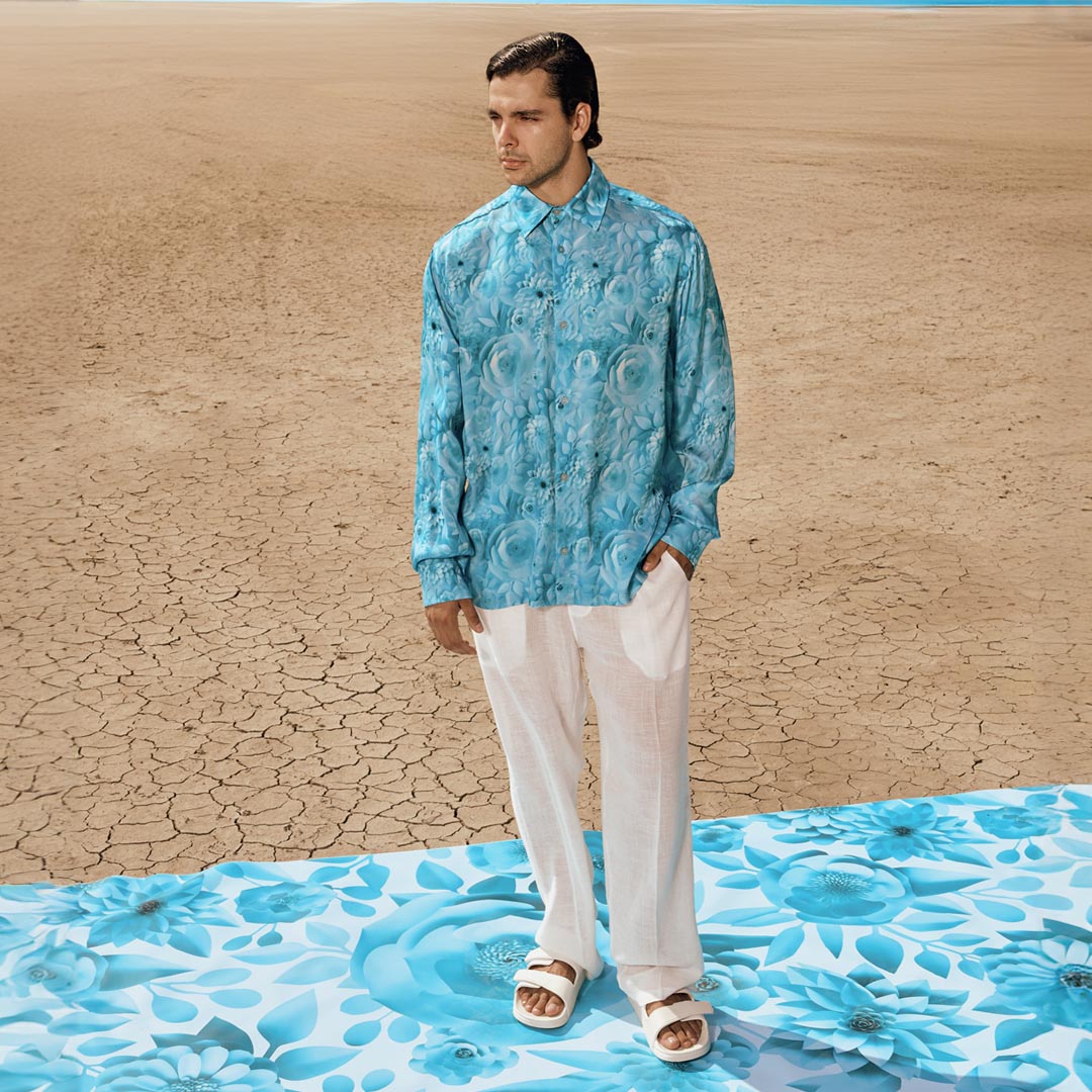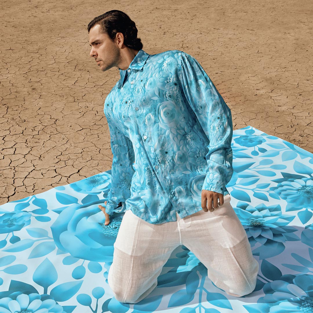 Drawing inspiration from the meticulous and delicate art of origami, MODUS VIVENDI’s design team has created a collection that embodies both the intricate beauty and precision of this ancient craft. The campaign features a man elegantly dressed in MODUS VIVENDI Origami apparel, standing in the vast, tranquil expanse of a desert. The stark, minimalist background enhances the vibrant and intricate blue floral designs of the clothing, highlighting the contrast between nature’s raw beauty and the sophisticated artistry of the collection. Each photograph encapsulates the essence of the Origami Line – a harmonious blend of traditional Japanese aesthetics and contemporary fashion.