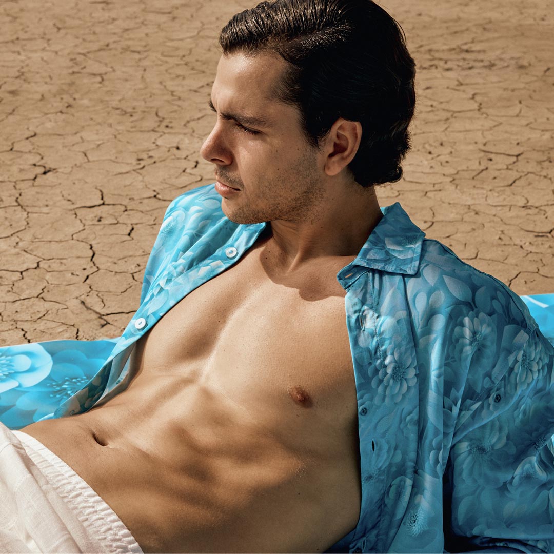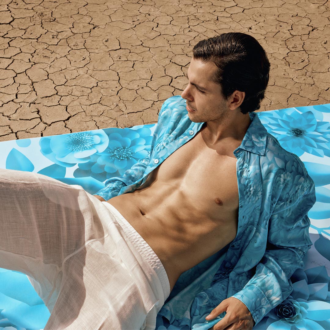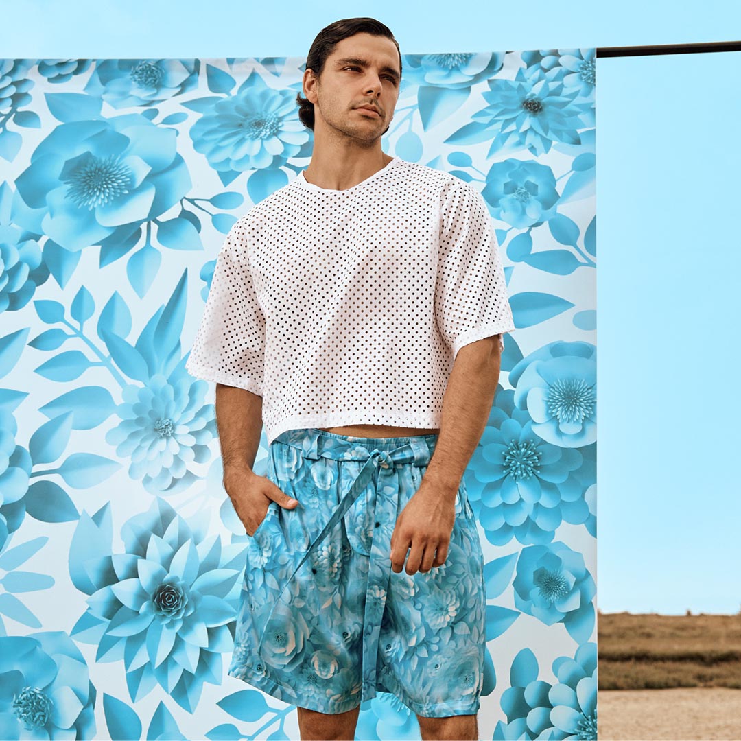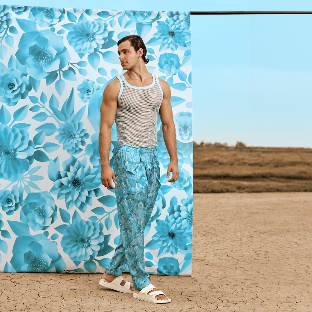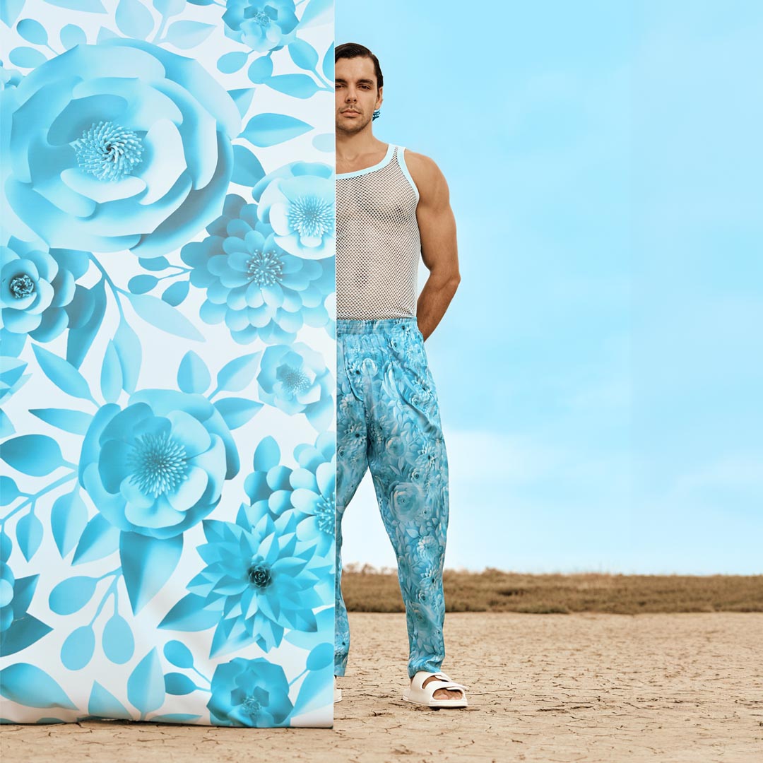 Drawing inspiration from the meticulous and delicate art of origami, MODUS VIVENDI’s design team has created a collection that embodies both the intricate beauty and precision of this ancient craft. The campaign features a man elegantly dressed in MODUS VIVENDI Origami apparel, standing in the vast, tranquil expanse of a desert. The stark, minimalist background enhances the vibrant and intricate blue floral designs of the clothing, highlighting the contrast between nature’s raw beauty and the sophisticated artistry of the collection. Each photograph encapsulates the essence of the Origami Line – a harmonious blend of traditional Japanese aesthetics and contemporary fashion.