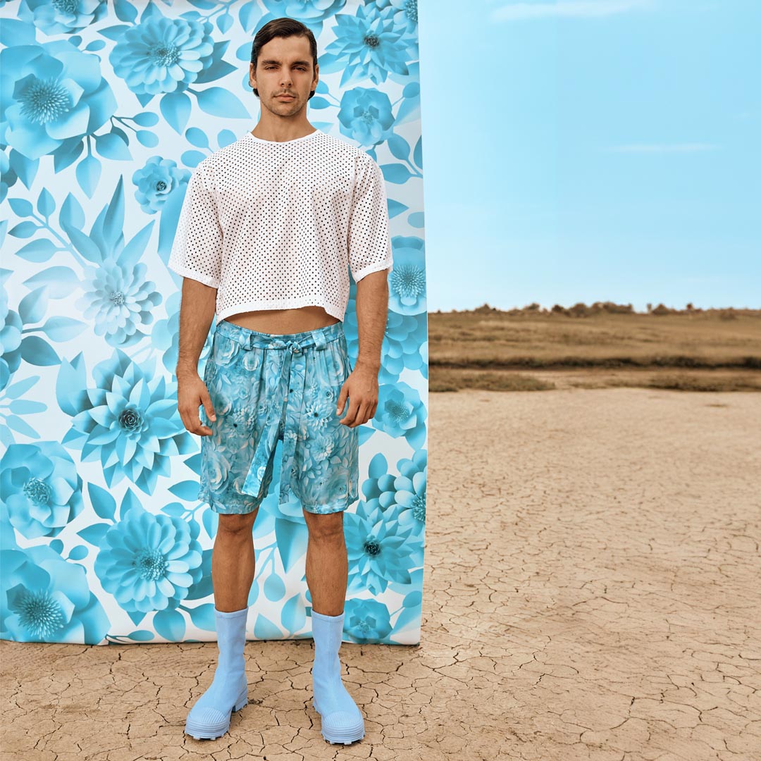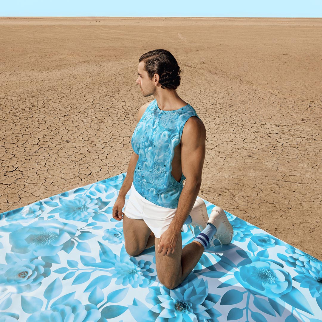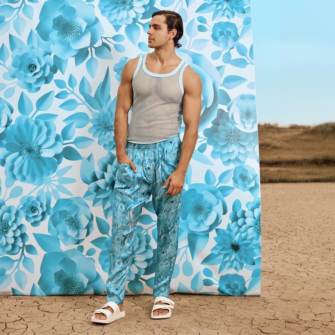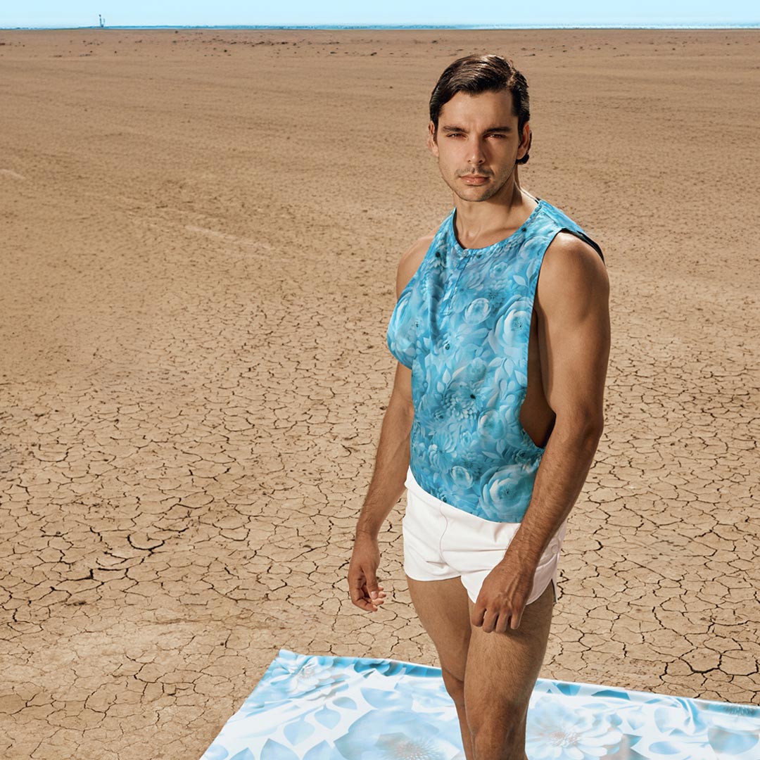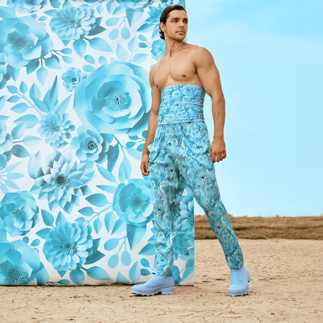 Drawing inspiration from the meticulous and delicate art of origami, MODUS VIVENDI’s design team has created a collection that embodies both the intricate beauty and precision of this ancient craft. The campaign features a man elegantly dressed in MODUS VIVENDI Origami apparel, standing in the vast, tranquil expanse of a desert. The stark, minimalist background enhances the vibrant and intricate blue floral designs of the clothing, highlighting the contrast between nature’s raw beauty and the sophisticated artistry of the collection. Each photograph encapsulates the essence of the Origami Line – a harmonious blend of traditional Japanese aesthetics and contemporary fashion.