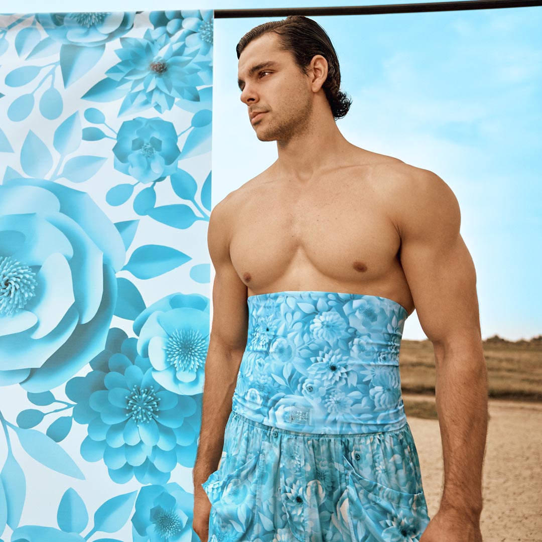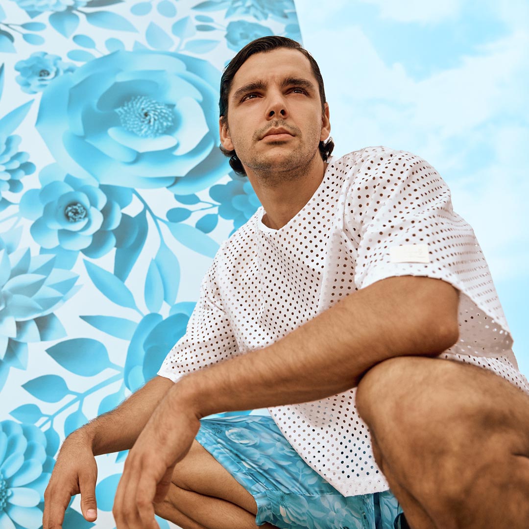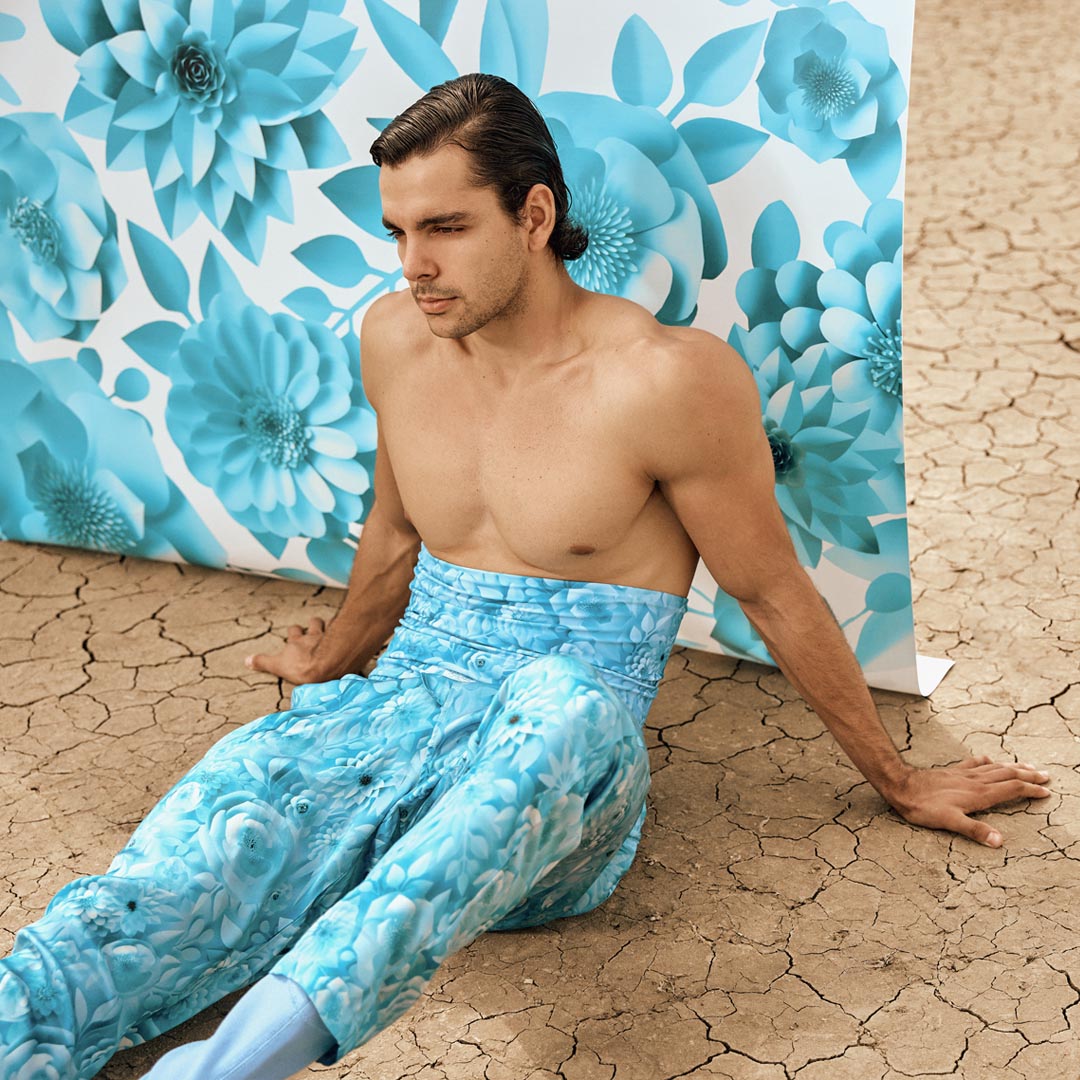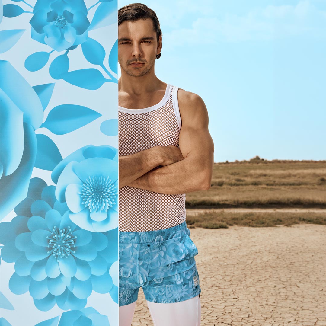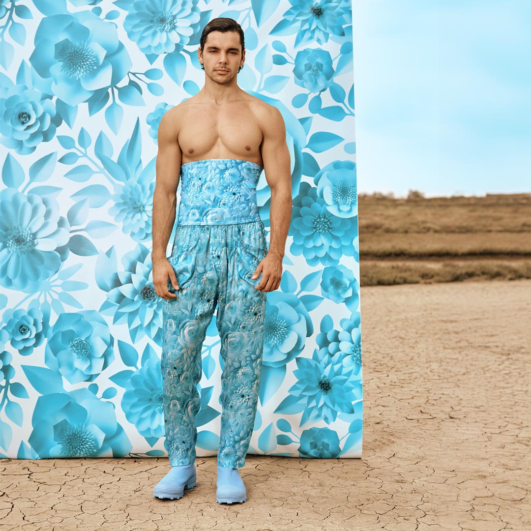 Drawing inspiration from the meticulous and delicate art of origami, MODUS VIVENDI’s design team has created a collection that embodies both the intricate beauty and precision of this ancient craft. The campaign features a man elegantly dressed in MODUS VIVENDI Origami apparel, standing in the vast, tranquil expanse of a desert. The stark, minimalist background enhances the vibrant and intricate blue floral designs of the clothing, highlighting the contrast between nature’s raw beauty and the sophisticated artistry of the collection. Each photograph encapsulates the essence of the Origami Line – a harmonious blend of traditional Japanese aesthetics and contemporary fashion.