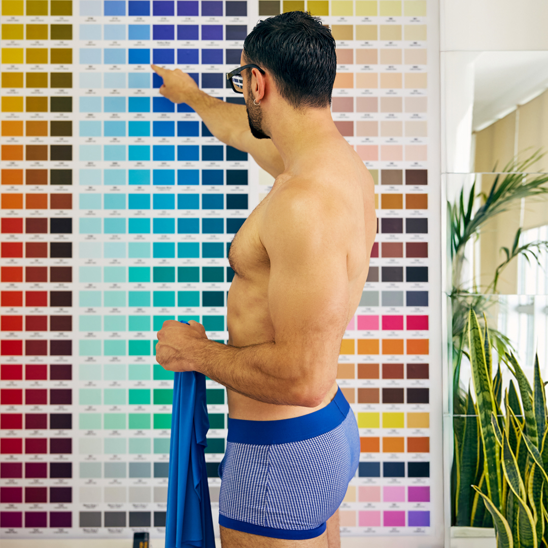 The Color Palette Campaign for the Pied De Coq Line is set in a creative atelier, where art and fashion collide. The backdrop features a vibrant wall covered in the collection’s color palette, echoing the idea of transformation and artistic reuse. A confident man is seen navigating the space—dressed in Pied De Coq pieces—surrounded by sketches, textiles, and tools of creation, celebrating the spirit of craftsmanship and conscious design.
