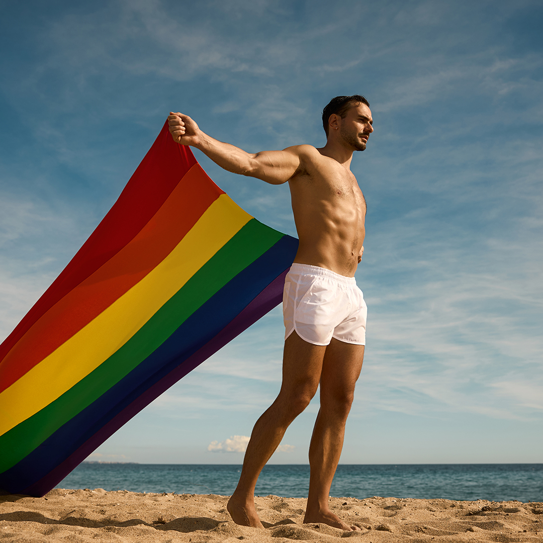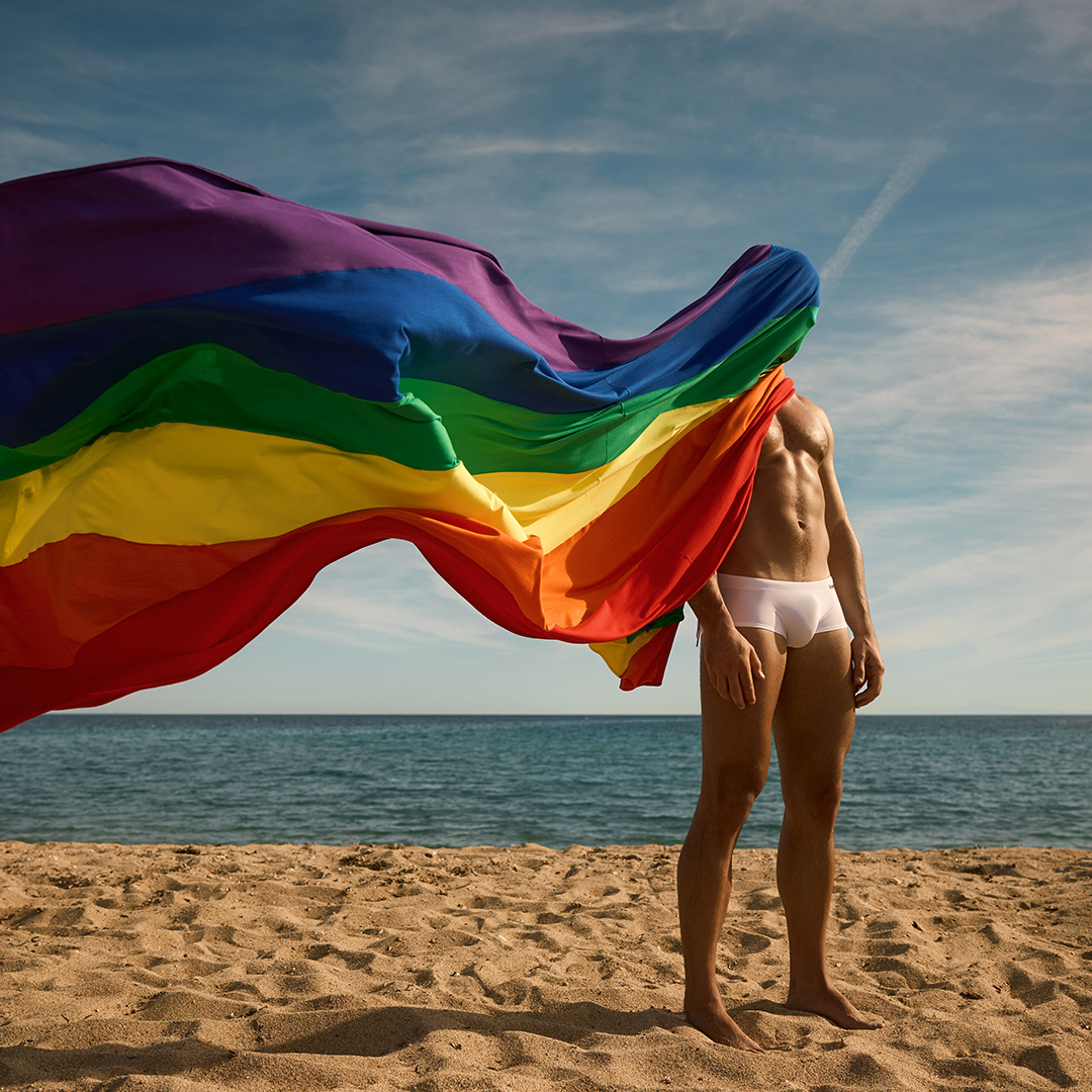 Crafted with bold, lavish designs that blend elements of both bikinis and briefs, each piece redefines traditional swimwear with a playful twist. A one-sided adjustable ribbon in rainbow hues brings movement, flair, and pride to every look.
