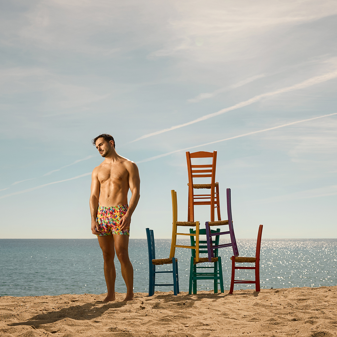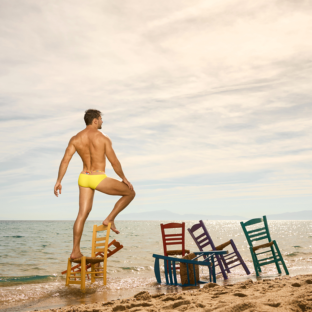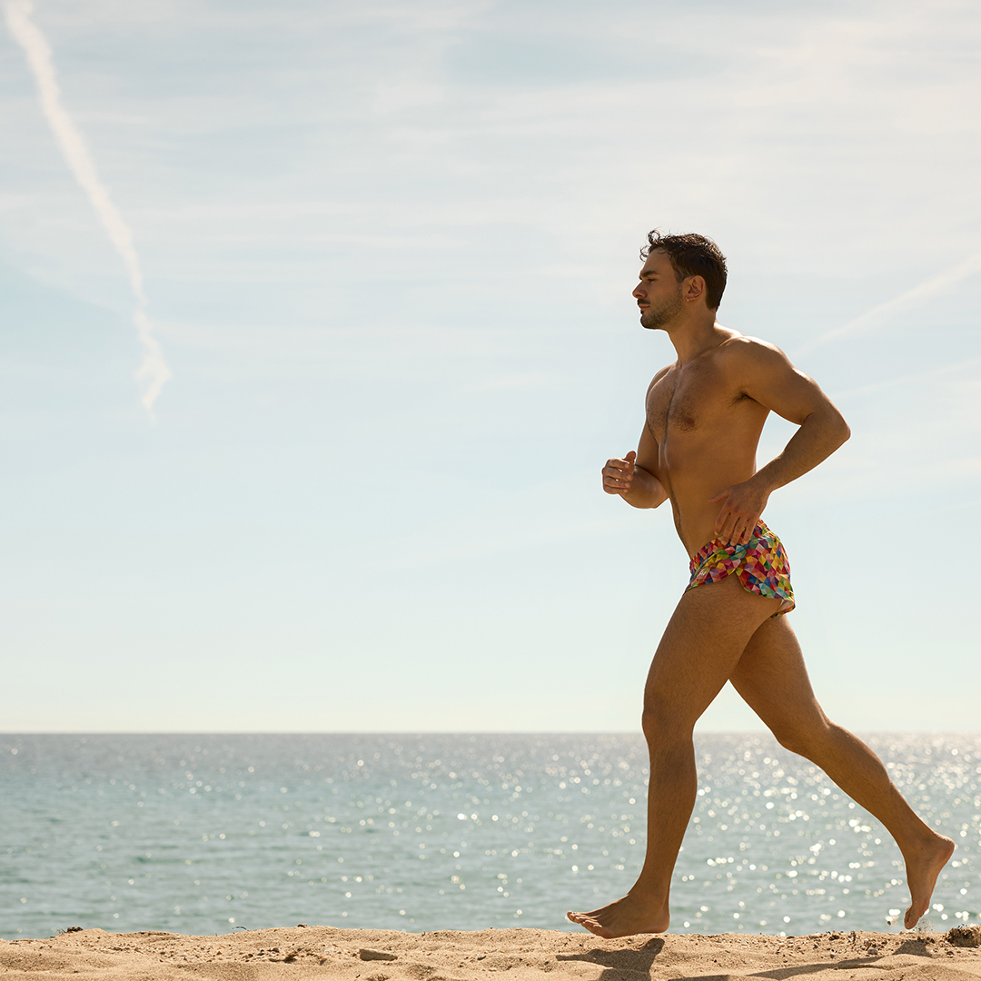 Shot against the shimmering coastline and sunlit waves, the Color Spectrum campaign captures the essence of freedom and radiance. The campaign follows a man unapologetically being himself – standing tall, relaxing in the tide, and running barefoot across the sand. Each scene, from serene to spirited, reflects the idea that confidence is found when you live in full color. The Rainbow swimwear becomes an extension of personality, movement, and pride.