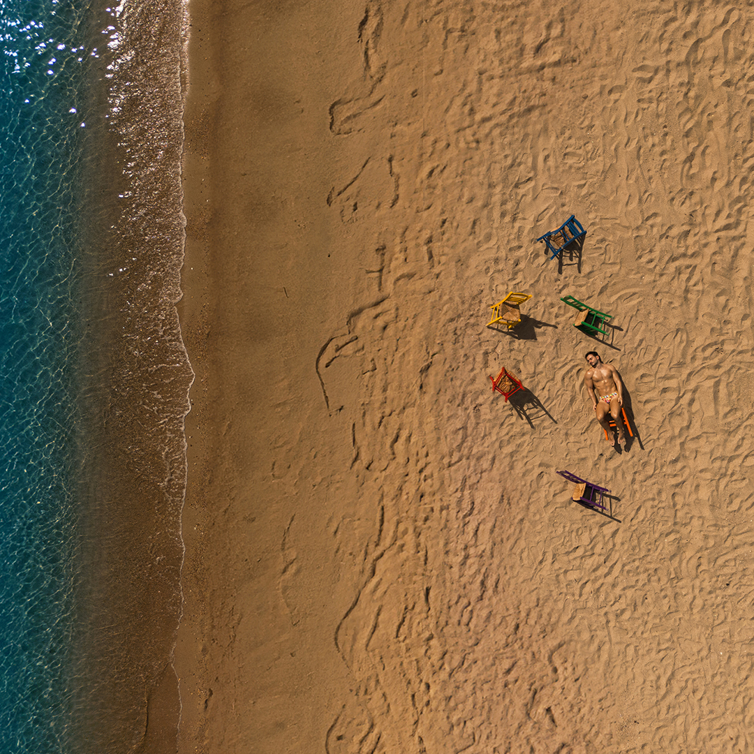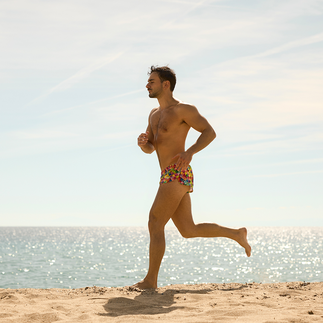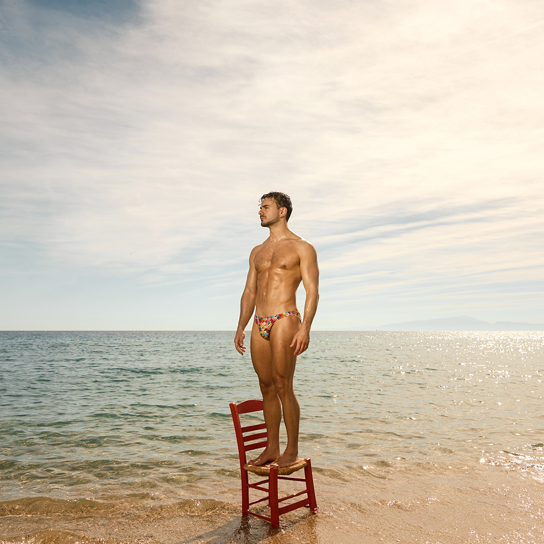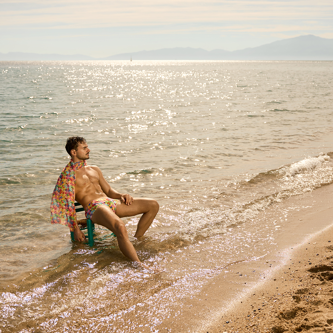 Shot against the shimmering coastline and sunlit waves, the Color Spectrum campaign captures the essence of freedom and radiance. The campaign follows a man unapologetically being himself – standing tall, relaxing in the tide, and running barefoot across the sand. Each scene, from serene to spirited, reflects the idea that confidence is found when you live in full color. The Rainbow swimwear becomes an extension of personality, movement, and pride.