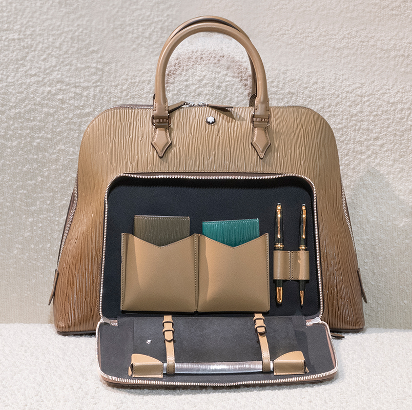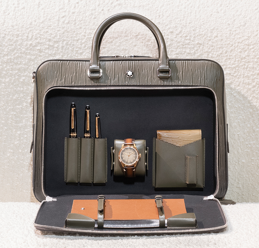 In the main showroom space, guests were able to view Montblanc’s Fall/Winter 2025 novelties, envisioned by Tomasetta as lifelong companions for personal discovery. At the heart of the new collections was the Writing Traveller, an elevated handbag design meticulously crafted to hold desk essentials, from writing instruments to notebooks. The piece bridges Montblanc’s leather craftsmanship with the universe of the desk.
