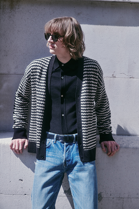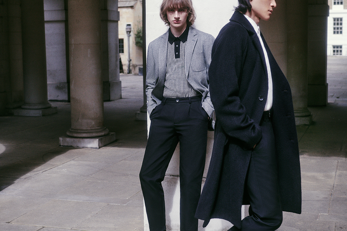Drawing inspiration from the work of 1960s creatives such as Messrs David Bailey, Kenneth Noland and Ms Bridget Riley, the collection mixes eclectic patterns and textures with unusual colour pairings of burnt orange, jade green, burgundy and shades of sky blue. Highlights include monochrome geometric knitwear, wavey printed accessories, unstructured tailoring, and refined outerwear, including wrap coats and Mr P.’s renowned leather and suede jackets. A new, expanded eveningwear and tuxedo offering will also be available featuring double-breasted and jacquard blazers, velvet dinner jackets in new colourways, alongside a double-breasted navy cashmere blend corduroy suit, a range of evening shirts and Derby and double-monk dress shoes.