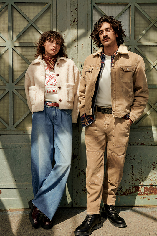 For men, the focus is on clean, all-over denim looks, combining rugged jeans made from heritage capsule fabrics with iconic jackets—some with corduroy or fur collars, others with striking ikat patterns that add a special touch. The styling is complemented by loose flannel jackets and straight-cut jeans that combine the authentic vintage spirit with urban casualness.