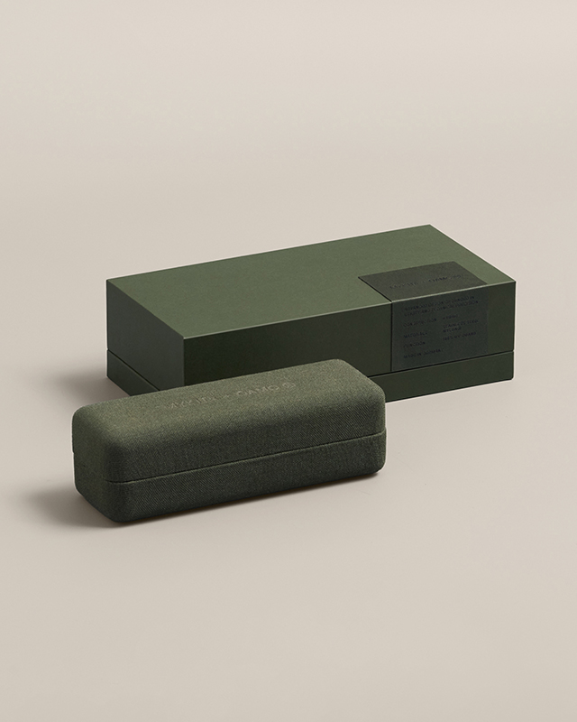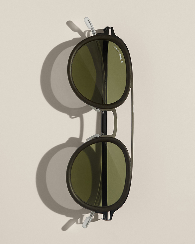 The MYKITA + OAMC capsule draws on the practical ethos of mid-century eyewear, reworking functional tropes into contemporary designs with a high-end edge. The hybrid frames combine lightweight stainless steel with MYKITA’s proprietary MYLON® material – its matte surfaces evoking industrial tactility, reminiscent of tools and field equipment. Flat base-two lenses define the boxy geometry, while MYLON® rings shaped like subtle blinders offer added side protection and sculptural accents.