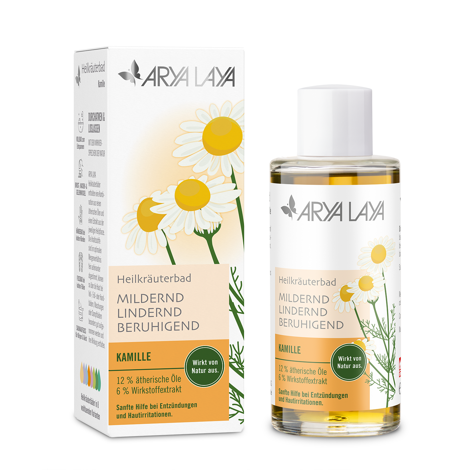 Das Kamille Heilkräuterbad pflegt sanft, lindert und beruhigt die Haut, insbesondere bei Hautunreinheiten und Entzündungen. Ein Voll-, Sitz- oder Fußbad mit dem Kamille Heilkräuterbad fördert die Wundheilung. Die natürlichen Inhaltsstoffe der Kamille entfalten im warmen Wasser ihren zarten, blumigen Duft und schenken ein Gefühl wohltuender Geborgenheit. Es hilft, Spannungsgefühle zu mindern und beruhigt Körper und Seele.