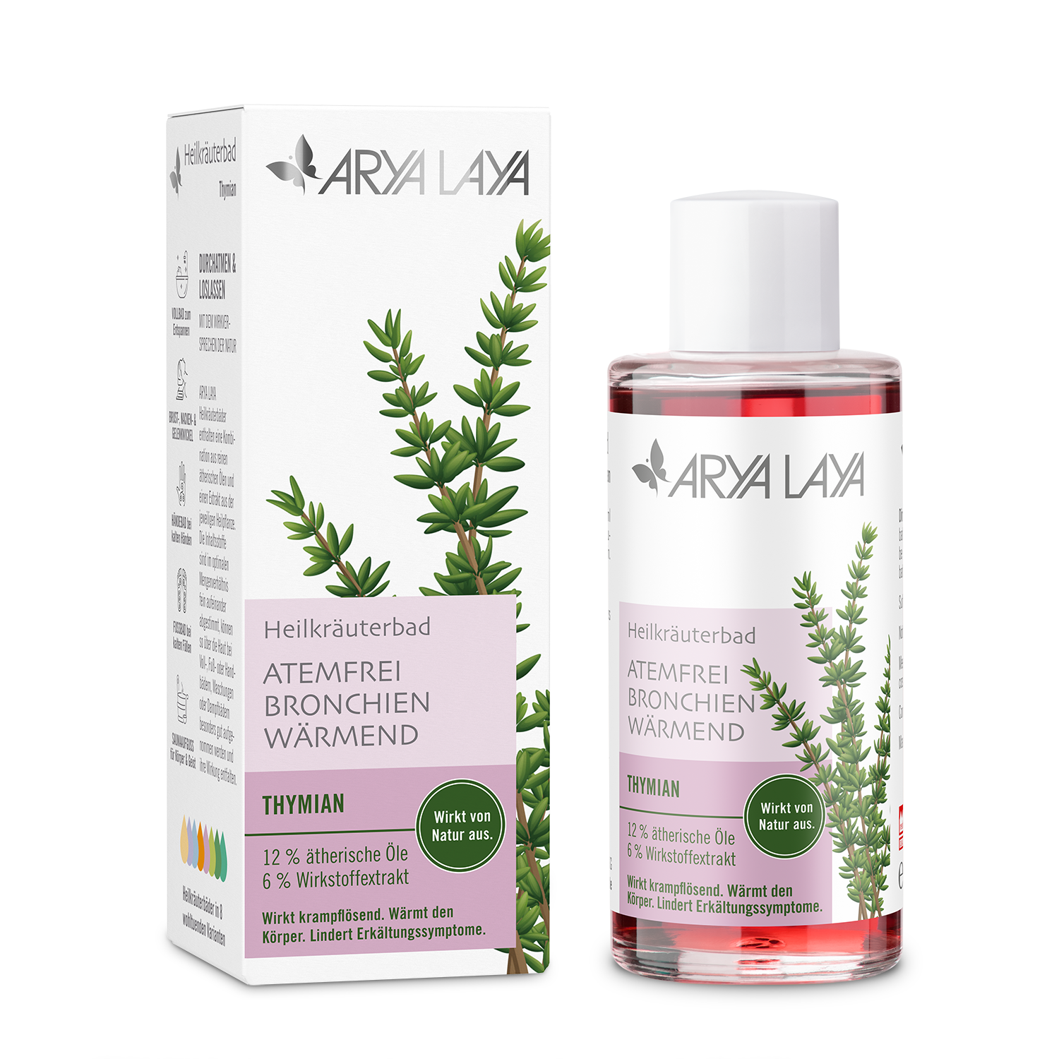 Das Thymian Heilkräuterbad entfaltet seine wohltuende Wirkung besonders bei Erkältungserscheinungen und Atemwegsbeschwerden. Die ätherischen Öle des Thymians unterstützen das freie Durchatmen, wirken befreiend auf die Bronchien und schenken eine angenehme Wärme, die sich sanft im Körper ausbreitet. Thymian unterstützt die körpereigenen Abwehrkräfte und hilft, sich nach einem langen Tag zu entspannen.