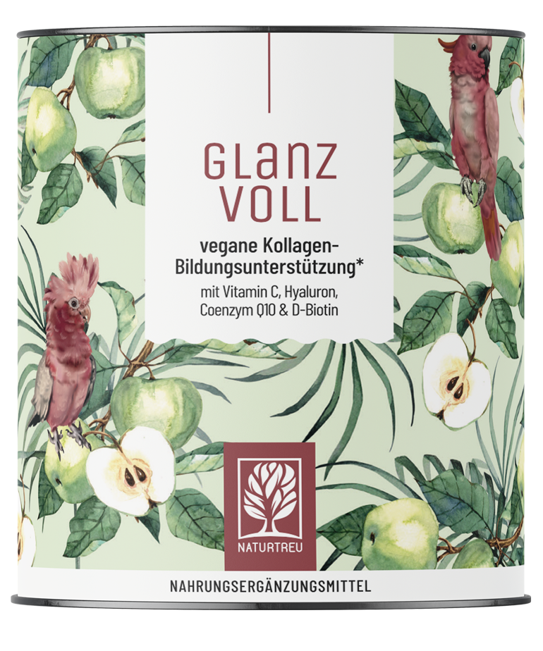 Die vegane Kollagenbildungshilfe GLANZVOLL soll mit Vitamin C, hochwertigen Aminosäuren und mikroverkapselten Milchsäure-Bakterien die körpereigene Kollagenproduktion anregen und so der Haut einen gesunden Glow schenken.