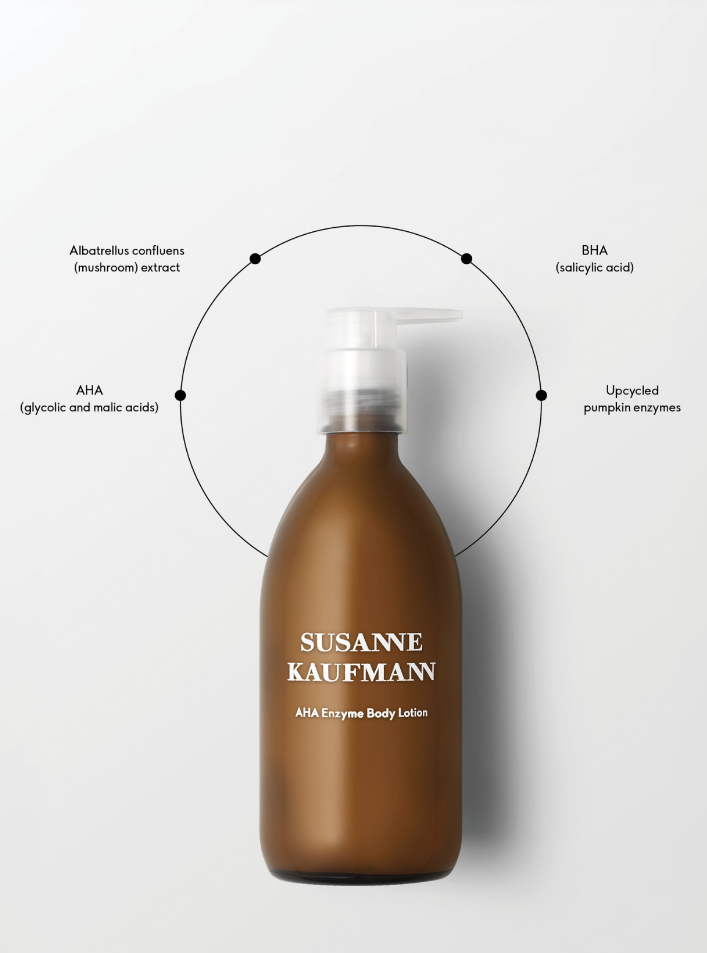 Mithilfe natürlicher Fruchtenzyme, einem der bekanntesten Inhaltsstoffe von Susanne Kaufmann, bietet die kraftvolle 10%ige Mischung aus AHA, BHA und Kürbisenzymen eine effektive Exfoliation ohne Irritationen. Die AHA Enzym Körperlotion verstärkt die Wirkung feinster natürlicher Inhaltsstoffe mit modernster Hautpflegewissenschaft und liefert transformative Ergebnisse, die sonst nur von professionellen Behandlungen erwartet werden – jetzt als Produkt für zuhause.